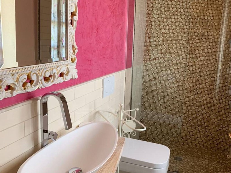 Al Piano Superiore ci sono: Due Camere matrimoniali, di cui una con bagno e doccia privato, l’altra è una Suite con stanza armadio e bagno con vasca e doccia. Tutte le camere e il bagno della suite sono vista piscina.