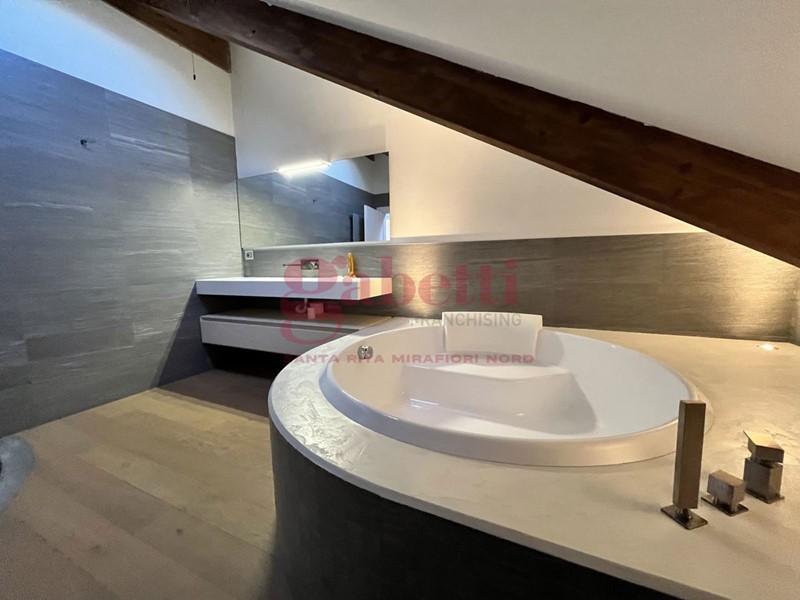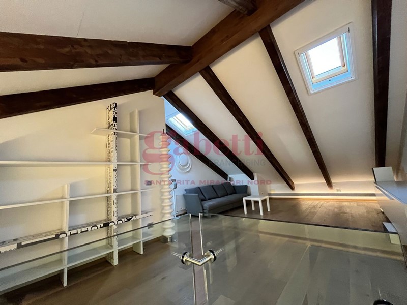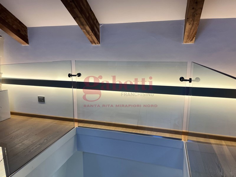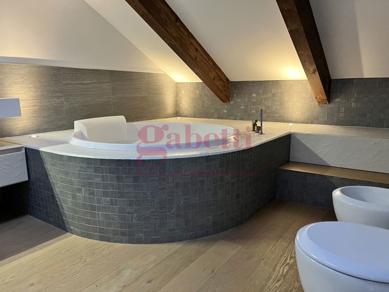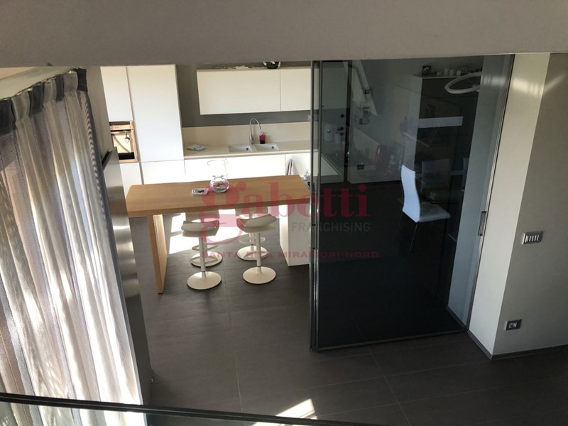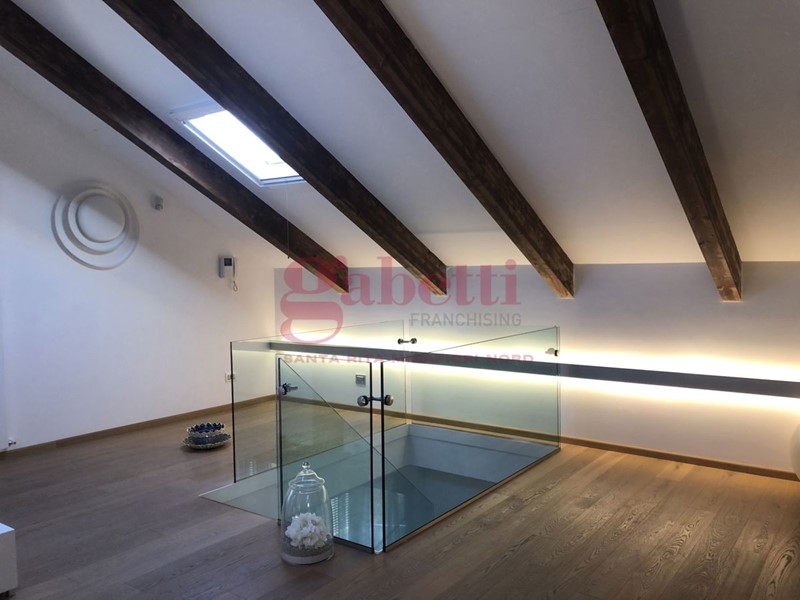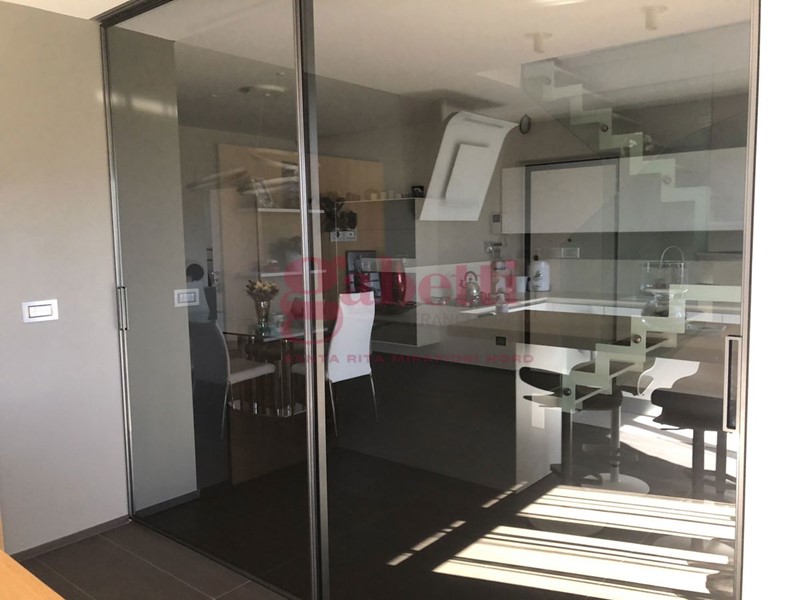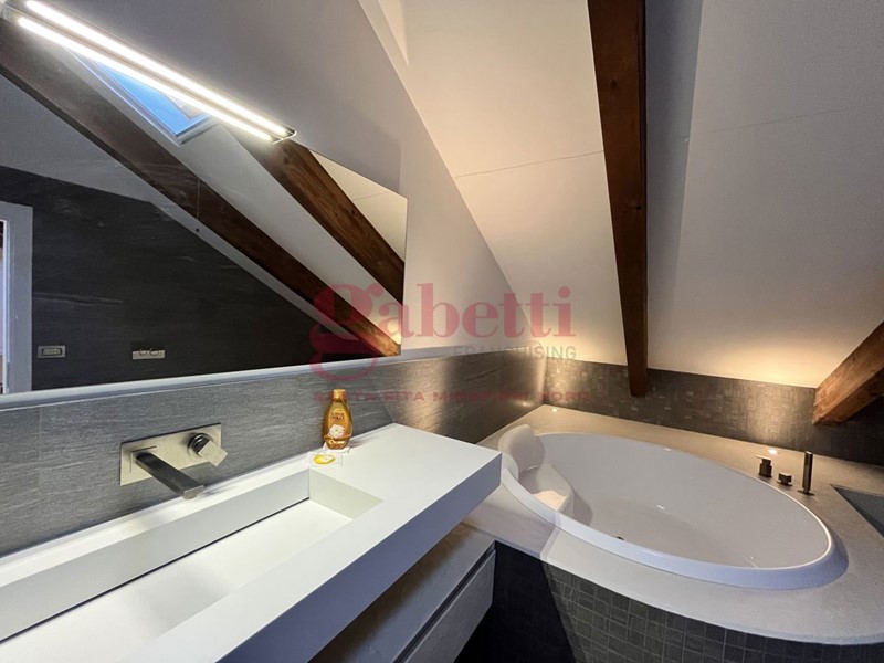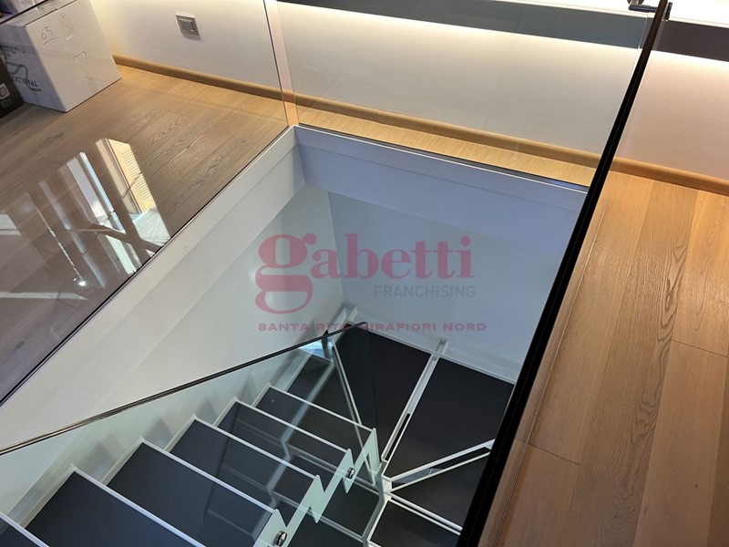 ? splendido appartamento con rifiniture di alto standing ed ottimamente accessoriato: portoncino blindato, videocitofono, impianto di antifurto, scala interna in vetro e acciaio, infissi esterni in legno a taglio termico, inferriate di sicurezza, zanzariere, infissi interni moderni, splendida parete mobile di divisione cucina/ salone Rimadesio in vetro, pavimentazioni in gres porcellanato al piano primo, in parquet al piano superiore, termoarredi di design, vasca circolare di grande effetto nel servizio al piano superiore, arredi servizi su misura in materiali di pregio, grandi e numerosi velux al piano mansardato elettrificati con controllo anche da remoto;