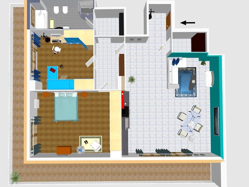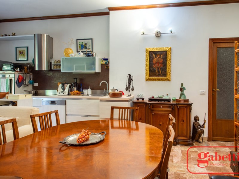 Immediatamente dopo la porta di ingresso emerge nella sua generosa grandezza un salone di rappresentanza dove è inserita incastonata la cucina.