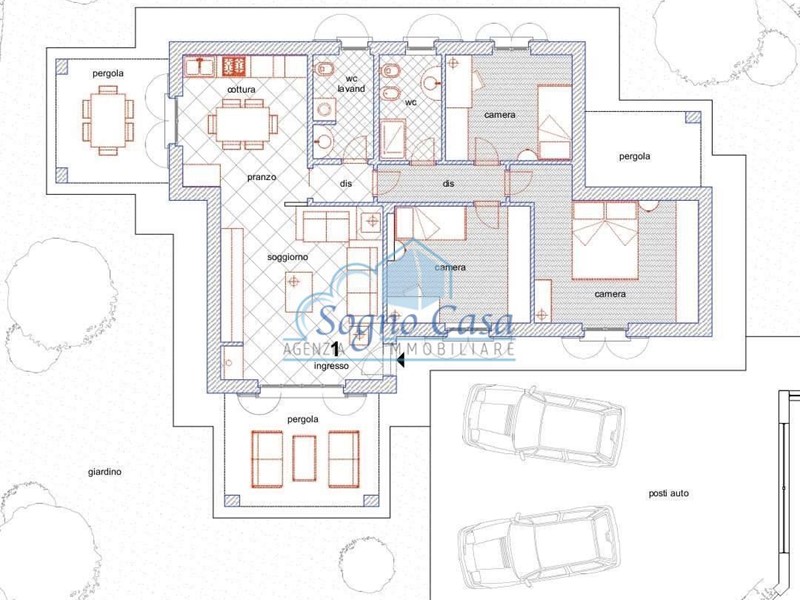 La villa è composta da ingresso da pergolato dalla quale si accede nell'ampio soggiorno open space con zona cottura a vista, disimpegno, doppi servizi e tre camere da letto. Giardino circostante di 200 mq e due posti auto interni.