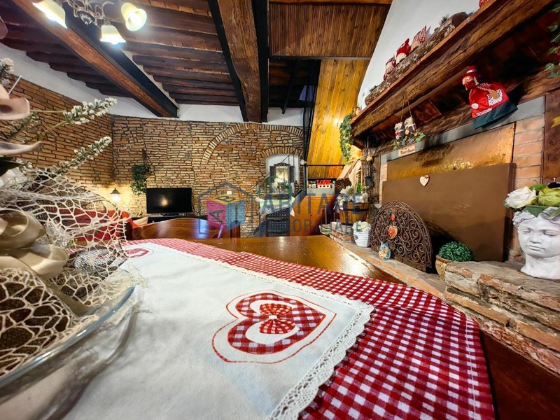 La spaziosa zona giorno con angolo cottura è arricchita da un camino originale di fine 800 e una stufa a pellet per un'atmosfera calda e accogliente.