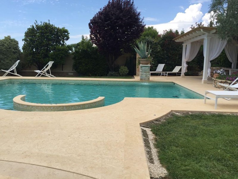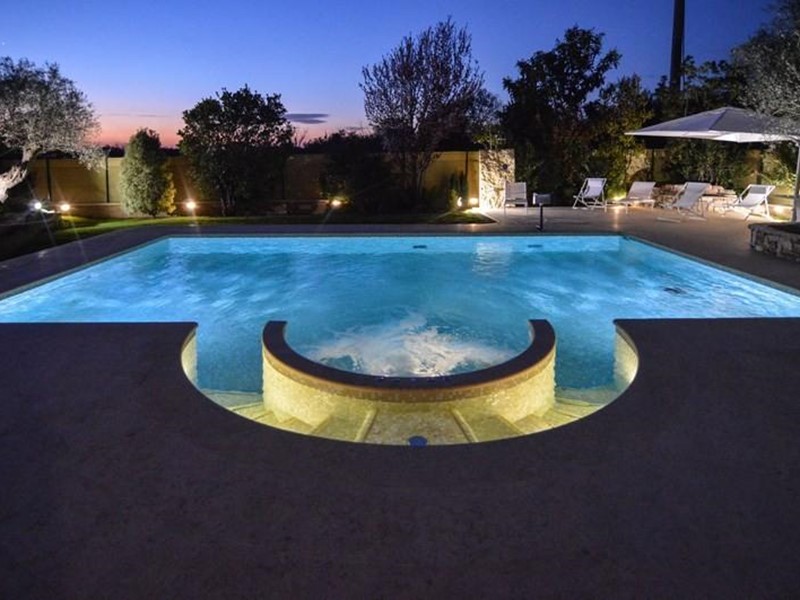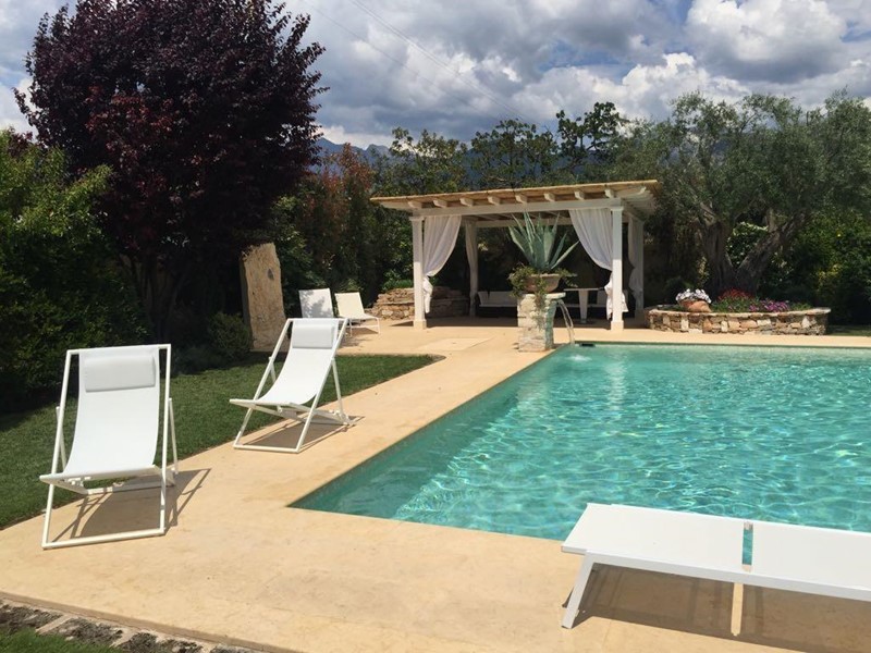 Annessa al lato frontale dell'immobile principale si trova la Piscina con idromassaggio e cascata, illuminata sia internamente che esternamente, con doccia, ombrellone e sedie a sdraio. Infine, congiunta all'immobile principale, è presente un'ulteriore veranda, coperta da una tettoia.