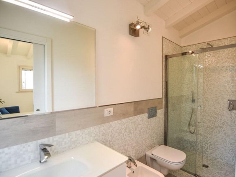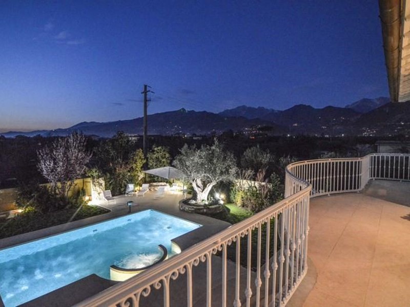 • Il piano primo comprende: due camere matrimoniali, entrambe dotate di balcone e servizio esclusivo, uno con doccia, l'altro con vasca Jacuzzi, ed un ampio terrazzo con meravigliosa vista panoramica sulla piscina e sulle Alpi Apuane, fornito con mobili da esterno.