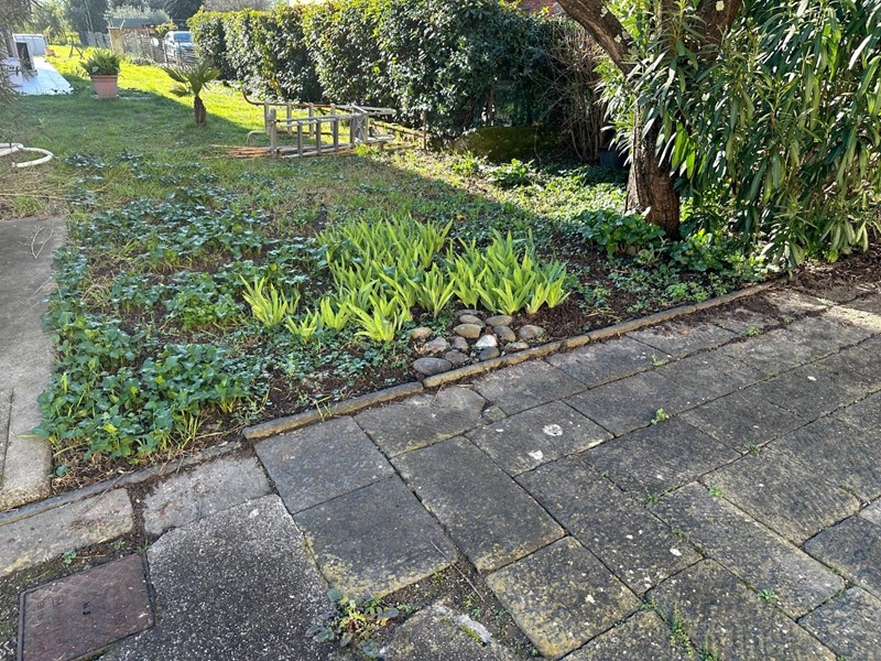 A corredo, ampia resede lastricata di circa 180 mq, chiudibile, dove sussiste un manufatto a ripostiglio e un giardinetto privato di 80 mq.