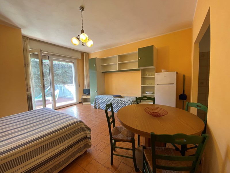 San Bartolomeo al Mare a 1,2 km dal mare proponiamo in affitto ad uso turistico appartamento monolocale con ampio terrazzo situato al piano rialzato ed è composto da ingresso, monolocale con un letto matrimoniale, un divano letto da due posti singoli, zona pranzo, angolo cottura completamente attrezzato, bagno finestrato con vasca e lavatrice ed infine ampio terrazzo. Durante i mesi estivi si può usufruire gratuitamente di una piscina circondata da piante e fiori.