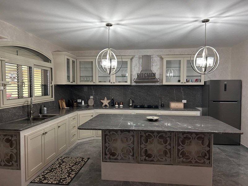 The ground floor is composed of a single room with living room - built-in kitchen with island, a bathroom and a front porch with a decorated marble table.