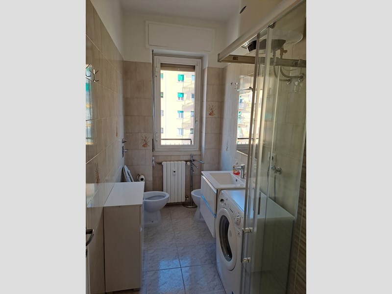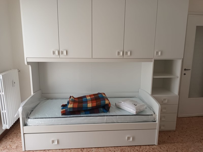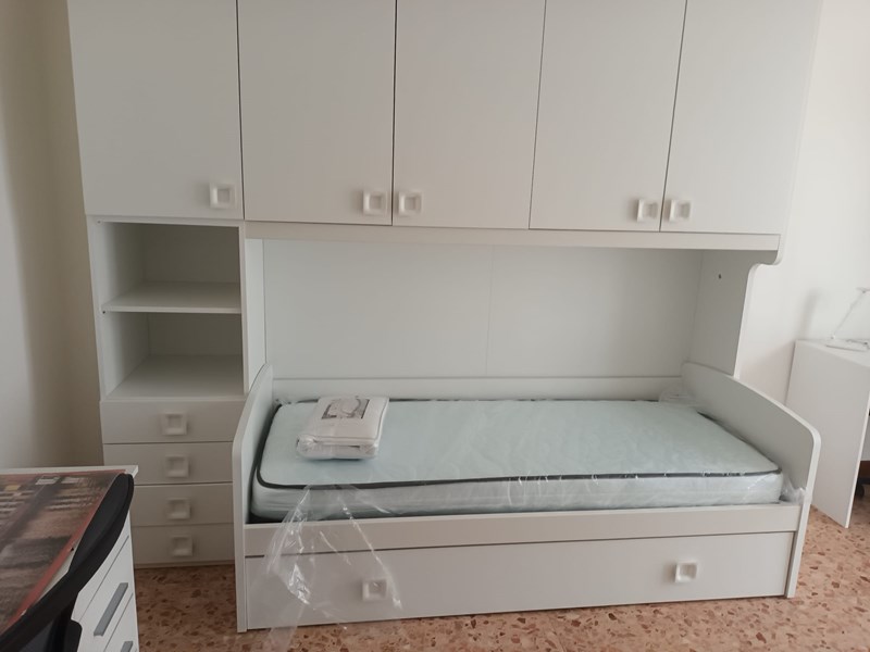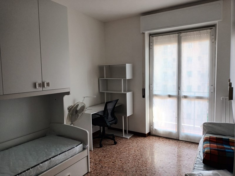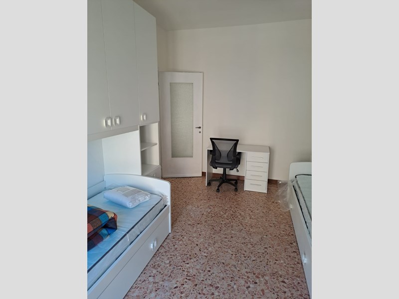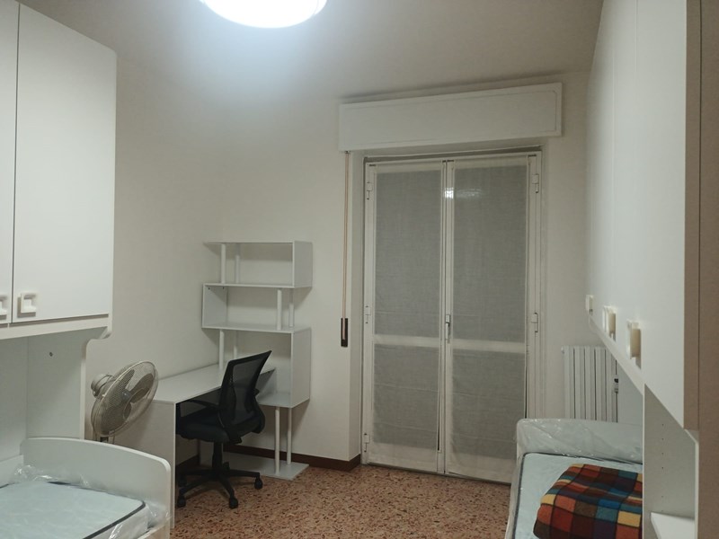 La camera oggetto del presente annuncio dispone di due letti singoli, di due armadi a ponte e di due scrivanie con cassettiera e libreria, presente lampadario con duplice funzione di ventilatore - accesso diretto al balcone.