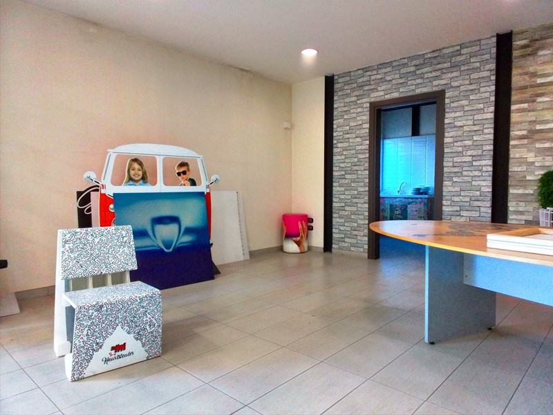 L'ala uffici di c.a. 233 mq, attigua al capannone produzione, è stata rimodulata con a servizio bagni, locale mensa, reception e show room open space (vedasi elaborati).