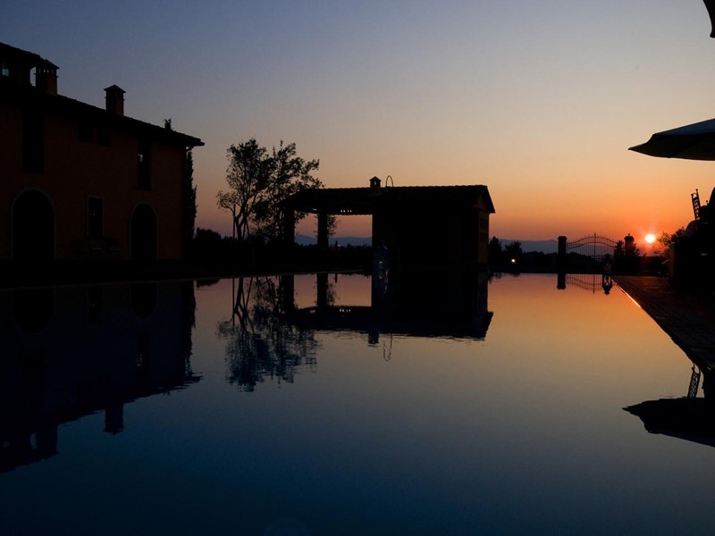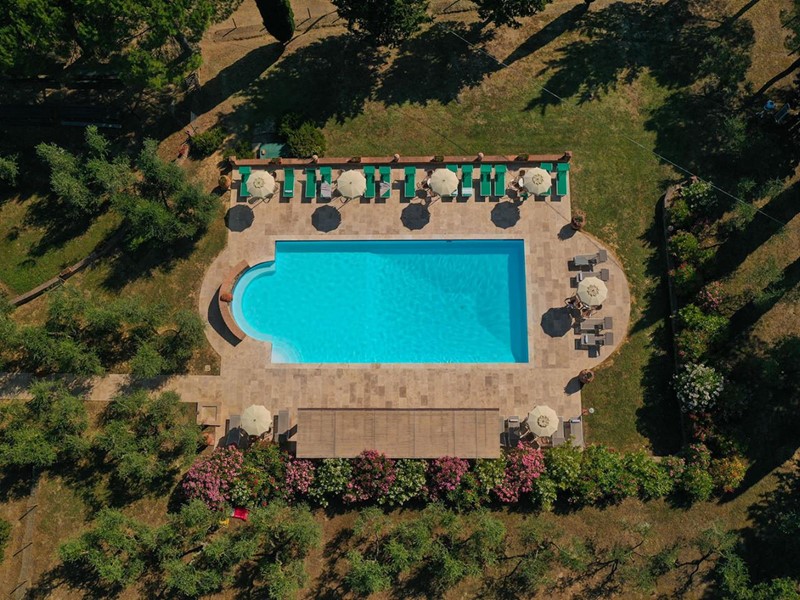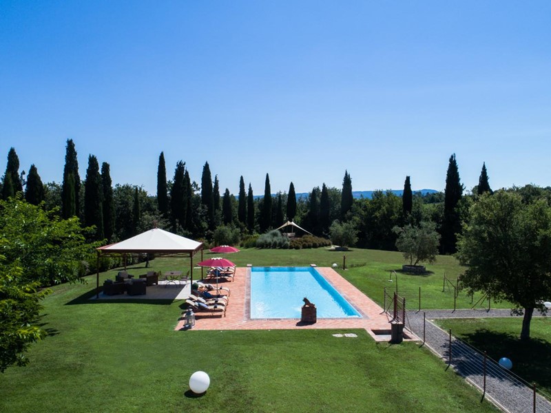 una scala a chiocciola porta alla "piccionaia", una tipica torretta posta al centro del tetto, trasformata in un locale con poltrone dal quale si gode una vista panoramica sulle colline a 360°. Tornando al piano terra la cucina e il soggiorno si aprono all'esterno su un pergolato. Tutta la villa è, inoltre, dotata di un impianto di riscaldamento da terra e aria condizionata, regolabili in modo indipendente da ogni vano, filodiffusione, allarme, cassaforte e telefono e comodo parcheggio coperto per auto. Una piccola dependance in stile rustico, aperta su 3 lati e attrezzata per poter cucinare, fare un barbecue o rilassarsi, una piscina di 15 m. x 5 m. profonda da 150 a 40 cm. con ingresso a scala romana, zona idromassaggio lombare e cervicale comandata da pulsanti pneumatici, a bordo sfioratore su 3 lati, mentre sul lato rimanente una piccola cascata dà sulla parte della piscina dedicata ai bambini, dove l'acqua è alta solo 40 cm; un solarium con lettini, sedie e piccoli tavoli per gli amanti del sole; un gazebo in ferro battuto con divani e poltrone per coloro che preferiscono l'ombra. Tutto attorno un ampio giardino di 5.000 mq. con la tipica flora toscana, recinzione con cancello elettrico e siepi di arbusti mediterranei proteggeranno la vostra privacy.