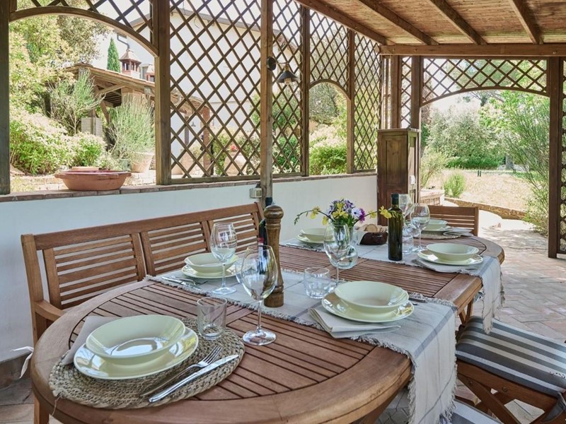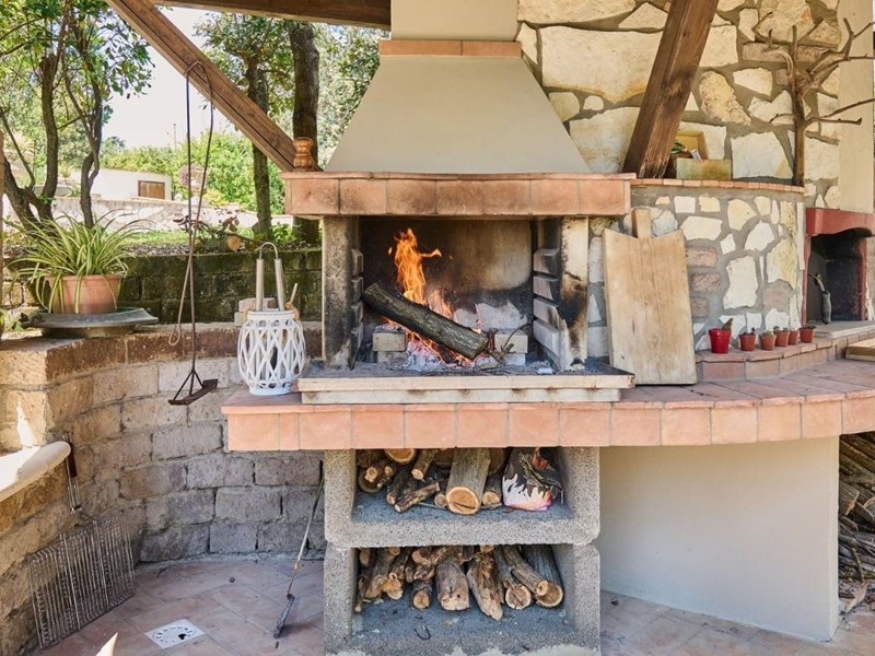Il casale è posizionato all'interno di un ampio giardino recintato di circa mq 5.000 con numerose piante, cespugli di piante fiorite e cespugli di piante officinali. In diversi punti del giardino, strategicamente posizionati si trovano due pergole panoramiche, con forno a legna, un piccolo annesso uso lavanderia e altri per il ricovero degli attrezzi da giardino.