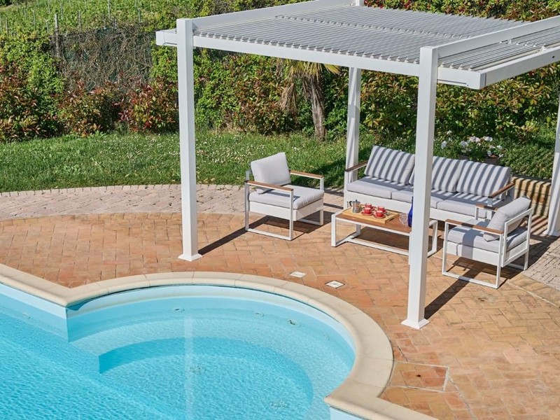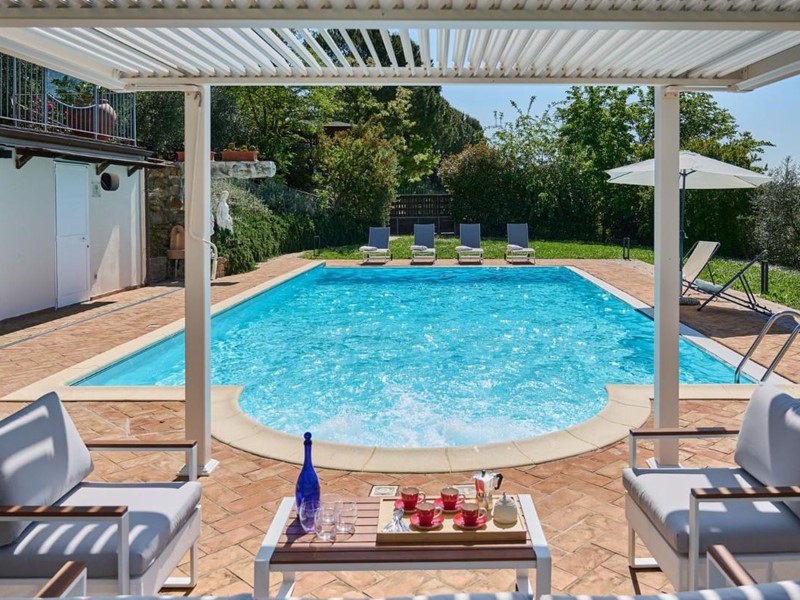 All'interno del giardino si trova la piscina, in bella posizione panoramica, misura 12x6 ed è senza uso di cloro, circondata dal solarium, ha accanto la pool house.