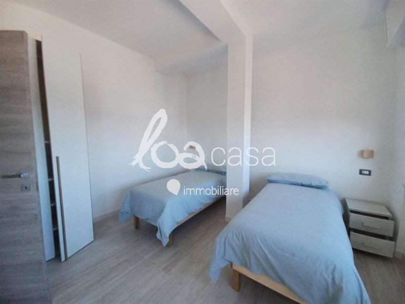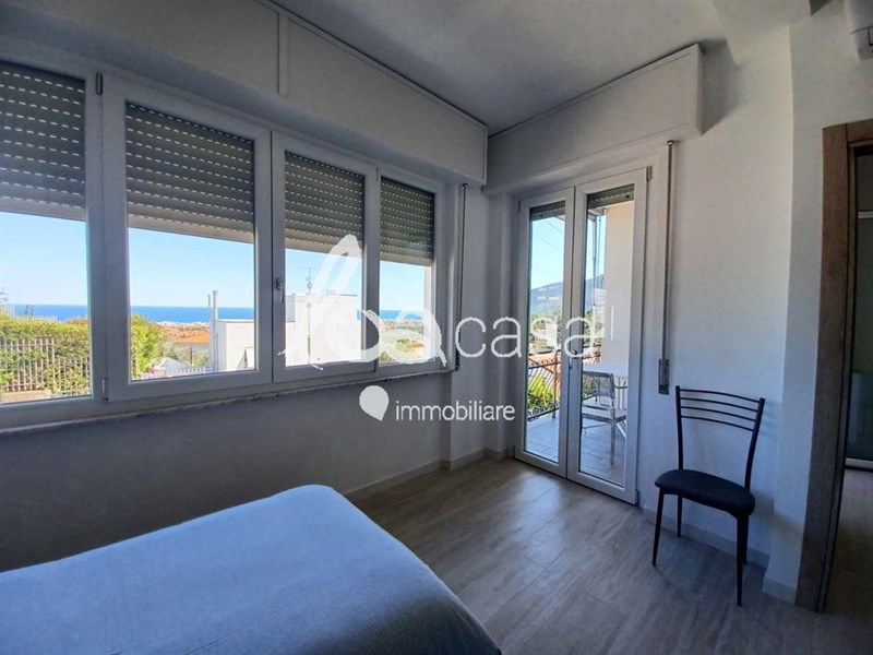 In signorile villa di 3 appartamenti, proponiamo in vendita quadrilocale al primo piano, composto da: ingresso su soggiorno con angolo cottura, disimpegno, due camere da letto matrimoniali, antibagno, bagno, terza camera con due letti singoli, terrazza coperta con vista mare, giardino e 2 posti auto.