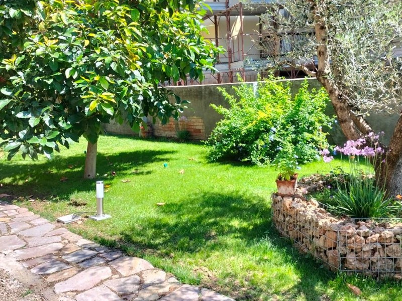 Al piano primo ingresso da cui si acced al ripostiglio all'ampio salone con terrazzo e alla cucina abitabile. Nel reparto notte insiste una camera matrimoniale, una camera doppia, una camera singola ed un bagno. Da una scala interna adiacente alla sala accediamo ad un garage ed un bagno, ad grande loggiato e un altro garage di 30 mq. Giardino di 250 mq. con doppio ingresso carrabile e con pozzo per l'irrigazione.