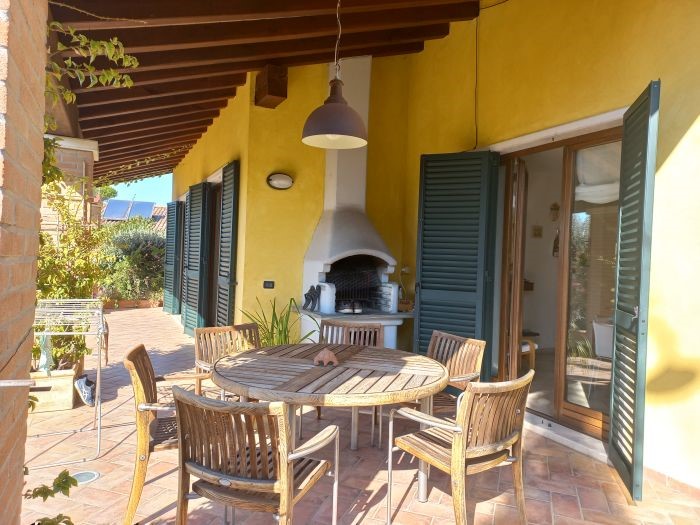 LUNI, in primissima collina, casa indipendente ben rifinita in buona posizione con vista aperta sino al mare. L'immobile in ottimo stato è disposto su vari livelli ed è così composto da ingresso, ampio salone con camino e doppie porte finestre su portico con travi di legno a vista, attrezzato ed aperto sul giardino, disimpegno con cucina e sala da pranzo anch'essa con camino e con porta finestre sullo stesso portico del soggiorno e su ulteriore veranda laterale a piano giardino, bagno di servizio e ripostiglio. Qualche gradino, ci porta al piano superiore dove troviamo, due camere ciascuna con la propria cabina armadio, un bagno con doccia e vasca idromassaggio e camera padronale con al suo interno cabina armadio e bagno, saliamo ancora qualche gradino e troviamo grande soppalco attrezzato in parte come studio con porta finestra su balcone con vista sino al mare, in parte a salotto, oltre un ulteriore locale armadio e ripostigli nel sottotetto. Al piano seminterrato troviamo una grande taverna con uscita anche diretta verso l'esterno e locale tecnico/lavanderia, scendiamo ancora qualche gradino e troviamo un ampio garage dove possono essere ospitate sino a 3/4 auto. L'immobile è fornito di condizionatori ed è disponibile in breve tempo.