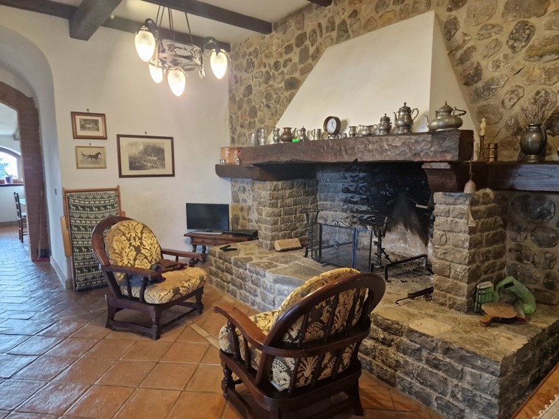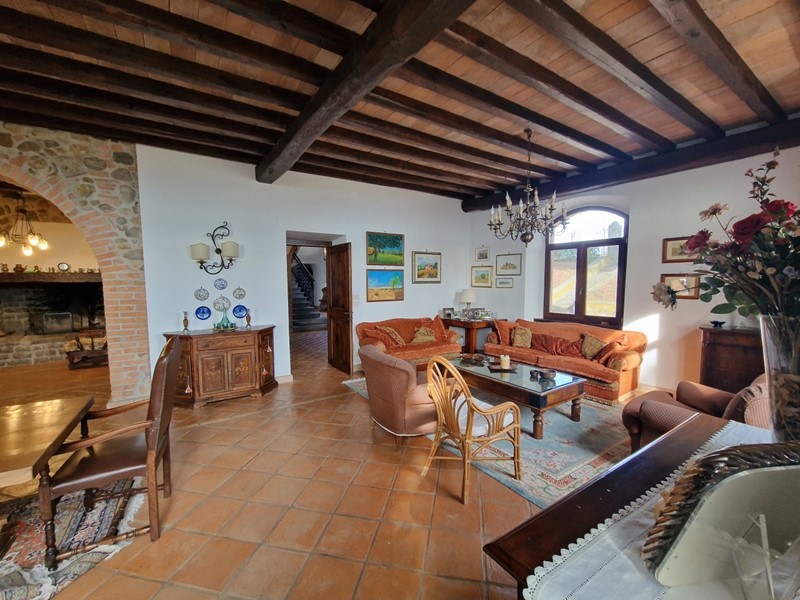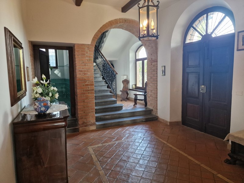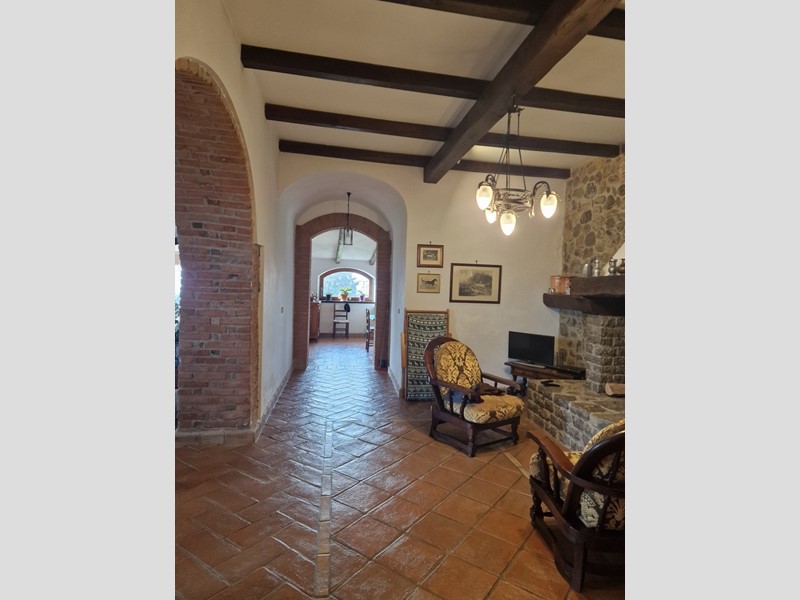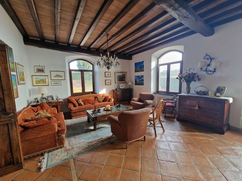 Il casale principale, risalente ai primi del ‘900 e recentemente ristrutturato, si sviluppa su tre livelli caratterizzati da ampi e luminosi vani. Al piano terra troviamo un ampio ingresso, il grande salone con soffitto in travi di legno, una sala adiacente con l’originale camino, la cucina abitabile con dispensa, il portico che si affaccia sul giardino e la piscina, disimpegno e bagno. Sempre al piano terra, lavanderia attrezzata, ripostiglio e garage. Al primo piano uno studio con ingresso indipendente, 4 ampie camere matrimoniali di cui 2 con bagno en suite e ulteriore bagno. Al piano mansardato 2 camere matrimoniali e bagno.
