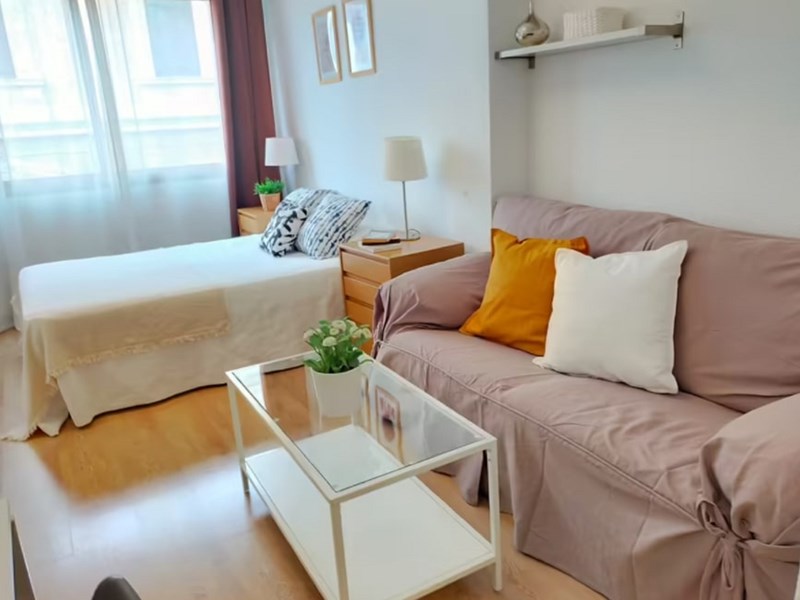 Monolocale arredato molto luminoso che dispone di una piccola cucina americana integrata nel disimpegno e di un bagno completo con vasca, oltre ai servizi di aria condizionata caldo-freddo centralizzati e acqua calda compresi nel prezzo. Dotato di TV, lavatrice, frigorifero, piano cottura in vetroceramica a due fuochi e cappa aspirante. Ha un armadio a muro, un divano a due posti e un letto matrimoniale.