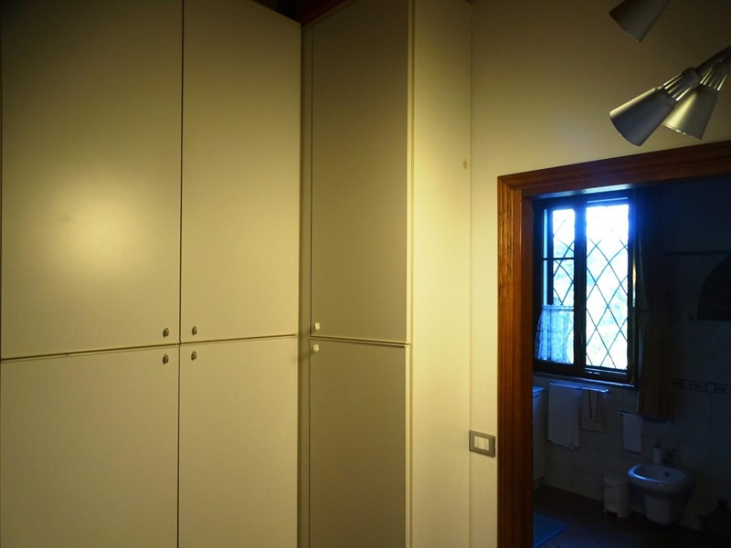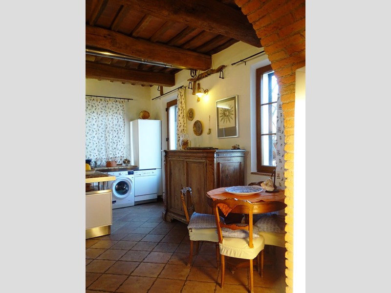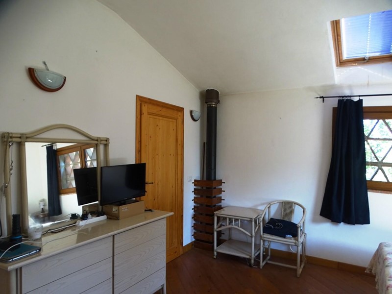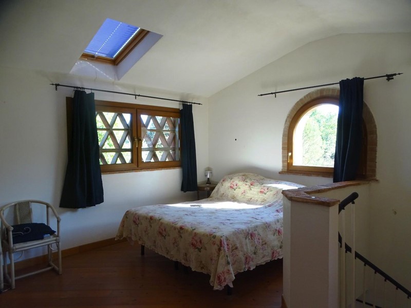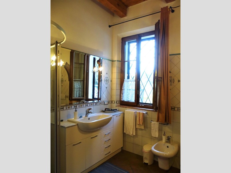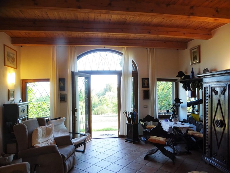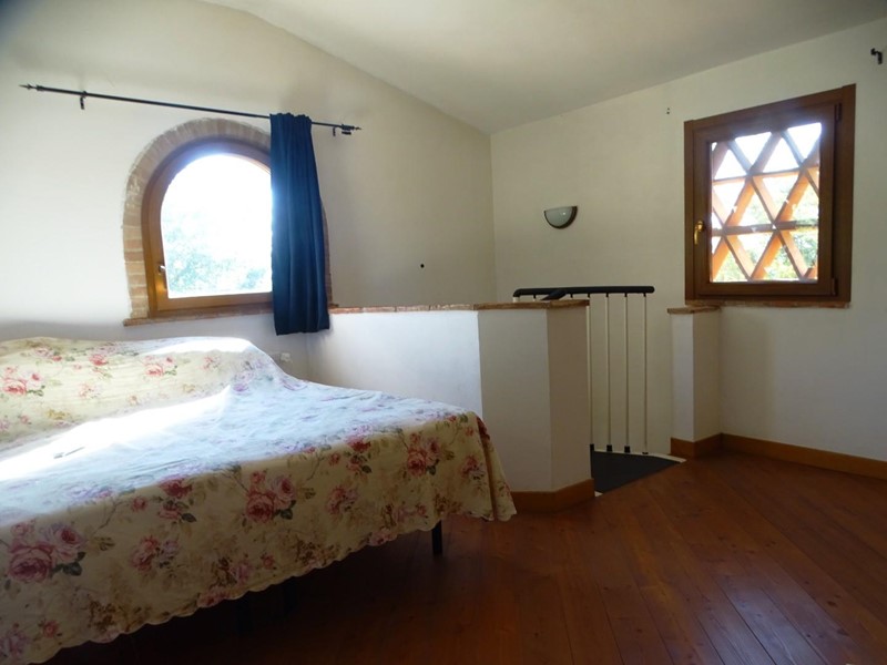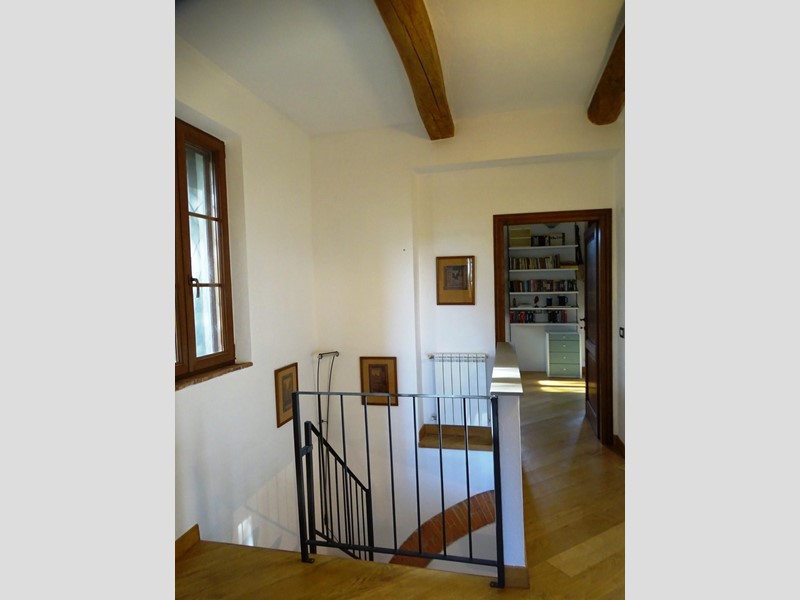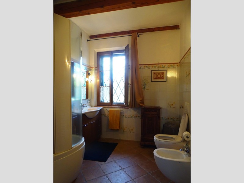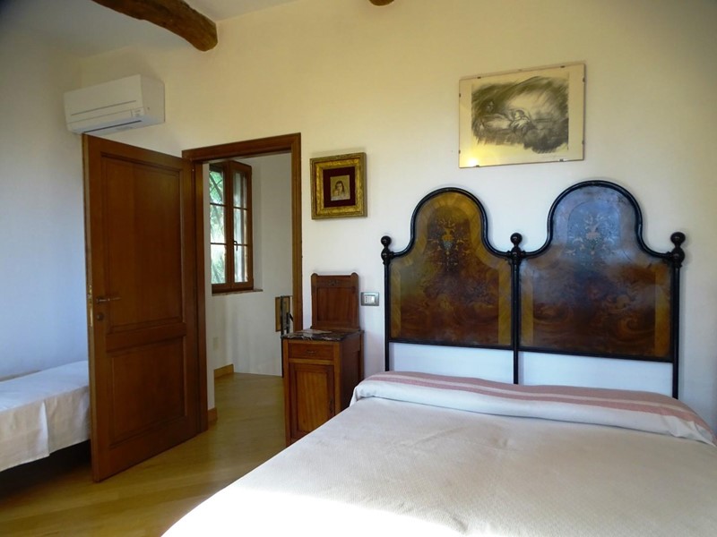 In the heart of Tuscany, a half-hour drive from Pisa and Florence airports, located in a dominant and panoramic position on the top of a small hill, isolated in the tranquility of the countryside but close to a town, property for sale consisting of a manor house with a total surface area of approximately 394 square meters with an approved project for the construction of a swimming pool in the surrounding park, a barn of approximately 91 square meters, located a few hundred meters away, and over 5 hectares of agricultural land. Between the villa and the barn there is a small olive grove and some fruit trees. The villa, on two floors of equal size, is currently divided into two independent apartments, each of which occupies a wing of the building, from ground to roof: the larger two thirds of the ground floor and the corresponding upper floor, the smaller the remaining third on both floors. Both are very well-kept and feature high-quality finishes. The larger apartment is characterized by a large living area on the ground floor, with an entrance/living/dining room with fireplace and a large eat-in kitchen, as well as a closet and a bathroom with an anteroom. Upstairs, the sleeping area includes three double bedrooms, two bathrooms with shower and a closet. The smaller apartment is also organized in a similar way, with an entrance/living/dining room with fireplace and kitchenette on the ground floor, where there is also a bathroom with shower, and two bedrooms and a bathroom with shower on the upper floor. Next to the building, a wooden structure houses two covered cars and supports the panels of a solar-thermal system. The hot water produced by the solar panels integrates that of the heating system and the sanitary water in the large apartment. The villa is also equipped with a photovoltaic system (peak power 8.2 kW) with storage batteries (9.6 kWh) for the production of electricity. Both apartments have hot/cold air conditioning systems. The barn, with its own access road, consists of a kitchen/dining room on the ground floor (part of which is used as a storage room) and a bedroom with bathroom on the upper floor, reached by a spiral staircase. A beautiful pergola allows the available space to be extended externally. The agricultural land is grazing and arable with large areas of coppice (almost 2.9 hectares).
