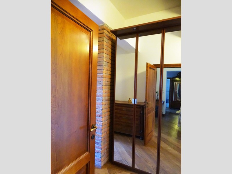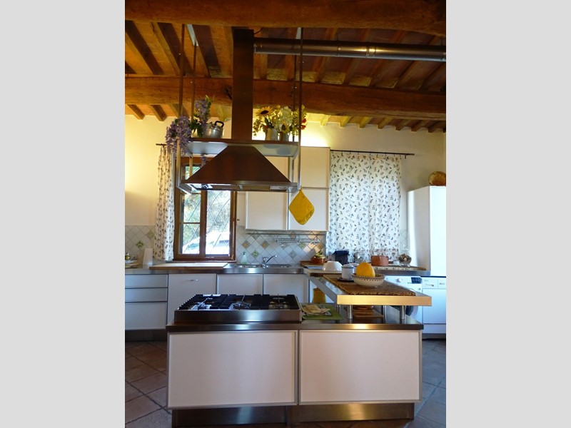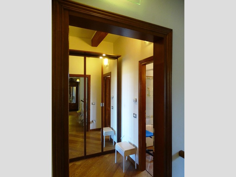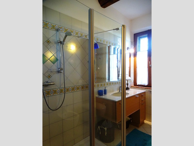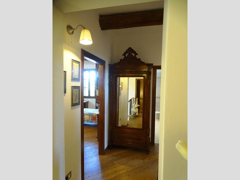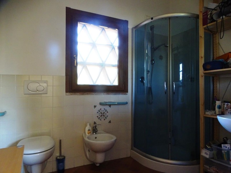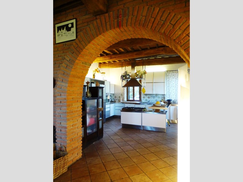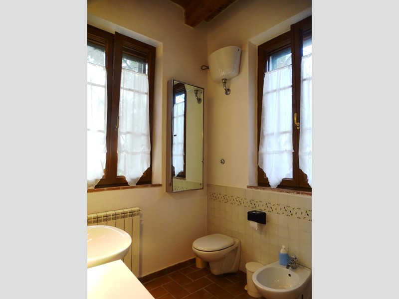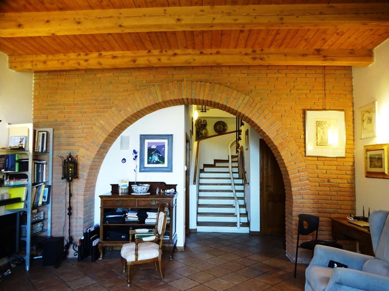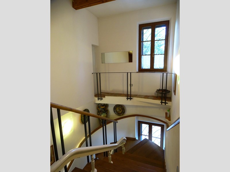 In the heart of Tuscany, a half-hour drive from Pisa and Florence airports, located in a dominant and panoramic position on the top of a small hill, isolated in the tranquility of the countryside but close to a town, property for sale consisting of a manor house with a total surface area of approximately 394 square meters with an approved project for the construction of a swimming pool in the surrounding park, a barn of approximately 91 square meters, located a few hundred meters away, and over 5 hectares of agricultural land. Between the villa and the barn there is a small olive grove and some fruit trees. The villa, on two floors of equal size, is currently divided into two independent apartments, each of which occupies a wing of the building, from ground to roof: the larger two thirds of the ground floor and the corresponding upper floor, the smaller the remaining third on both floors. Both are very well-kept and feature high-quality finishes. The larger apartment is characterized by a large living area on the ground floor, with an entrance/living/dining room with fireplace and a large eat-in kitchen, as well as a closet and a bathroom with an anteroom. Upstairs, the sleeping area includes three double bedrooms, two bathrooms with shower and a closet. The smaller apartment is also organized in a similar way, with an entrance/living/dining room with fireplace and kitchenette on the ground floor, where there is also a bathroom with shower, and two bedrooms and a bathroom with shower on the upper floor. Next to the building, a wooden structure houses two covered cars and supports the panels of a solar-thermal system. The hot water produced by the solar panels integrates that of the heating system and the sanitary water in the large apartment. The villa is also equipped with a photovoltaic system (peak power 8.2 kW) with storage batteries (9.6 kWh) for the production of electricity. Both apartments have hot/cold air conditioning systems. The barn, with its own access road, consists of a kitchen/dining room on the ground floor (part of which is used as a storage room) and a bedroom with bathroom on the upper floor, reached by a spiral staircase. A beautiful pergola allows the available space to be extended externally. The agricultural land is grazing and arable with large areas of coppice (almost 2.9 hectares).