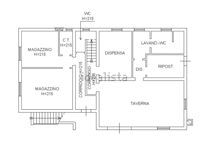 Il piano terra è composto da taverna, due magazzini, lavanderia, dispensa e ripostiglio.