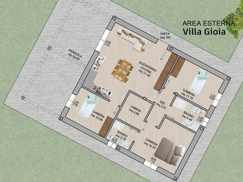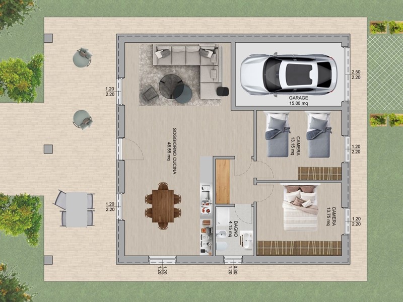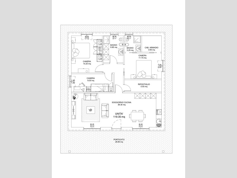 Il progetto originale prevede che l'abitazione si componga di un ampio soggiorno-cucina con affaccio diretto sul portico esterno, una suite padronale con bagno interno e cabina armadio, due camere doppie, disimpegno e secondo bagno. Tale idea progettuale è modificabile in base alle esigenze e alle richieste della committenza, ad esempio è possibile adibire l'intera area che dà sul portico alla zona giorno con l'eliminazione della terza camera, oppure destinare lo spazio della medesima camera a cucina, per chi preferisse mantenerla separata dal living, o ancora trasformare una delle stanze della zona notte in box auto.