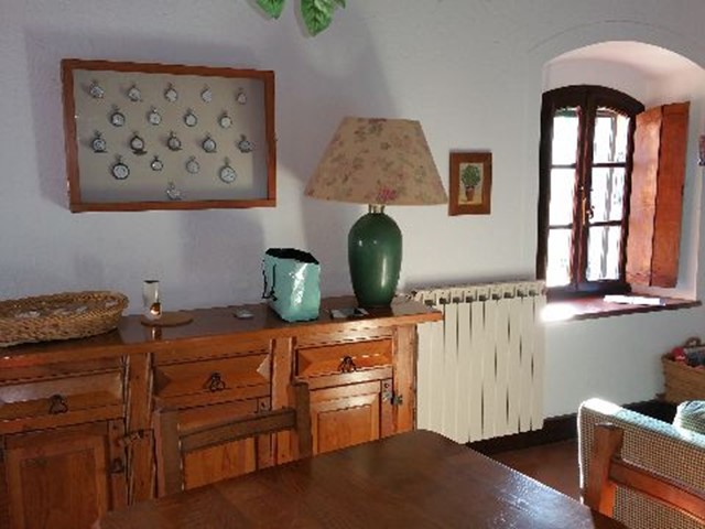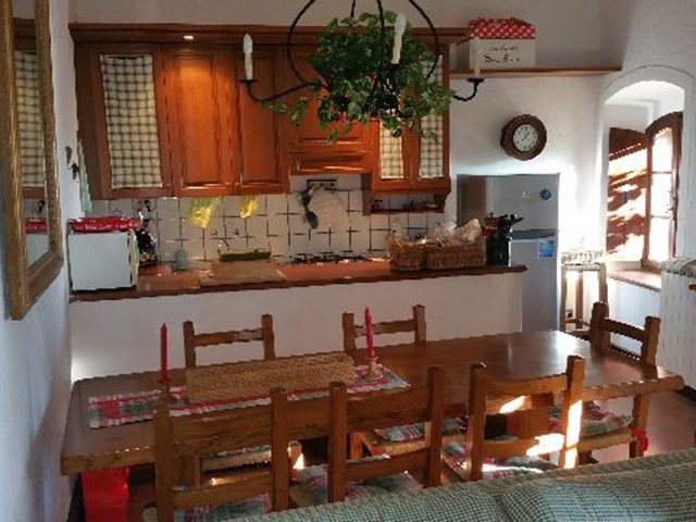l'immobile, in ordine, viene venduto arredato e si presenta con : ingresso, soggiorno con cucina a vista, grande camino e soffitto con travi a vista, camera matrimoniale con bagno e soppalco ad uso studio, ampio disimpegno da utilizzare eventualmente come salotto, ricavato nella roccia, con parete in sasso , ulteriore camere e bagno. la proprietà è tutta recintata, infissi in doppio vetro, zanzariere, allarmata. riscaldamento autonomo a gas metano. possiblità di ingresso sia dal borgo che dal percorso pedonale di accesso diretto ai parcheggi.