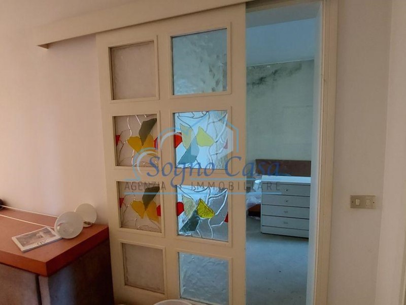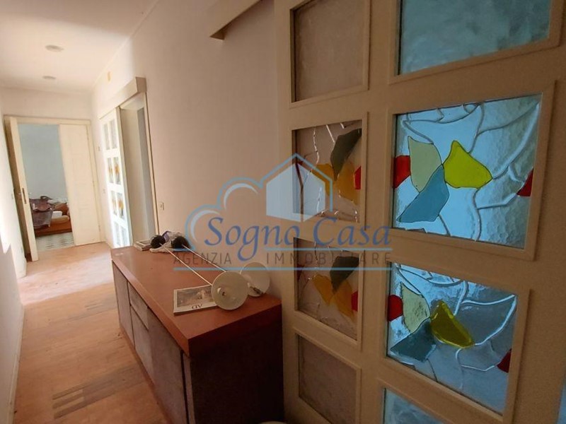 Ingresso dalla parte centrale e frontale della villa su corridoio all'appartamento del piano terra di 107 mq con sala - soggiorno, due camere matrimoniali, cucina e ripostiglio.