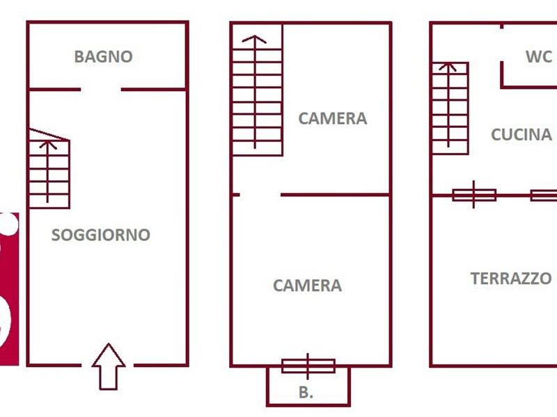 Ci troviamo a pochi passi dalla piazza principale; nelle vicinanze troviamo panifici, tabacchini, farmacia, posta e supermercati. Al piano terra troviamo l'ingresso nel soggiorno con, in fondo, il bagno con vasca; al primo piano un grande disimpegno con il vano scala e la camera da letto; al terzo piano la luminosa cucina con il secondo servizio. Punto di forza è rappresentato dal comodo terrazzino con uscita dalla cucina.