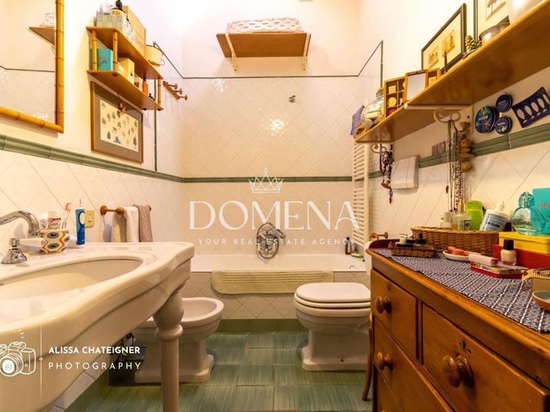 Il bagno, rifinito con cura, presenta una vasca da bagno che aggiunge un tocco di relax. Gli elementi di design contemporaneo si integrano armoniosamente con gli elementi tradizionali, creando un ambiente equilibrato.