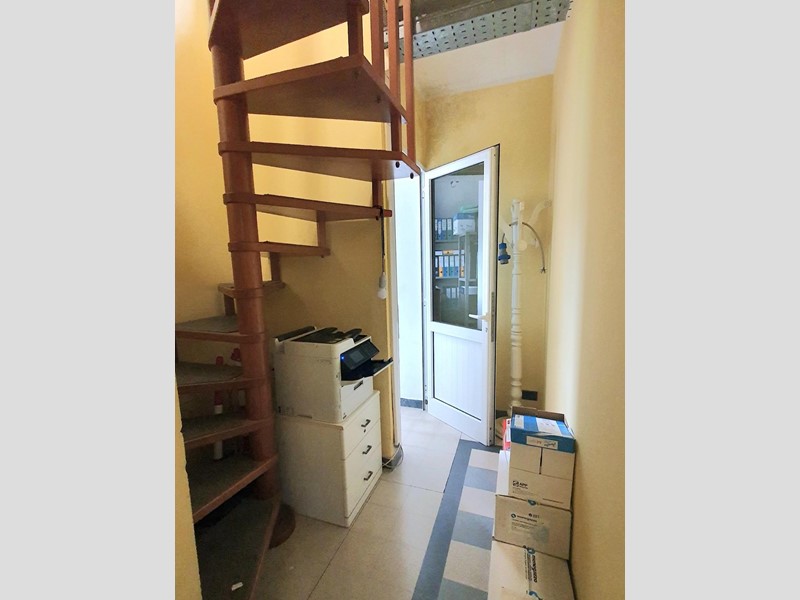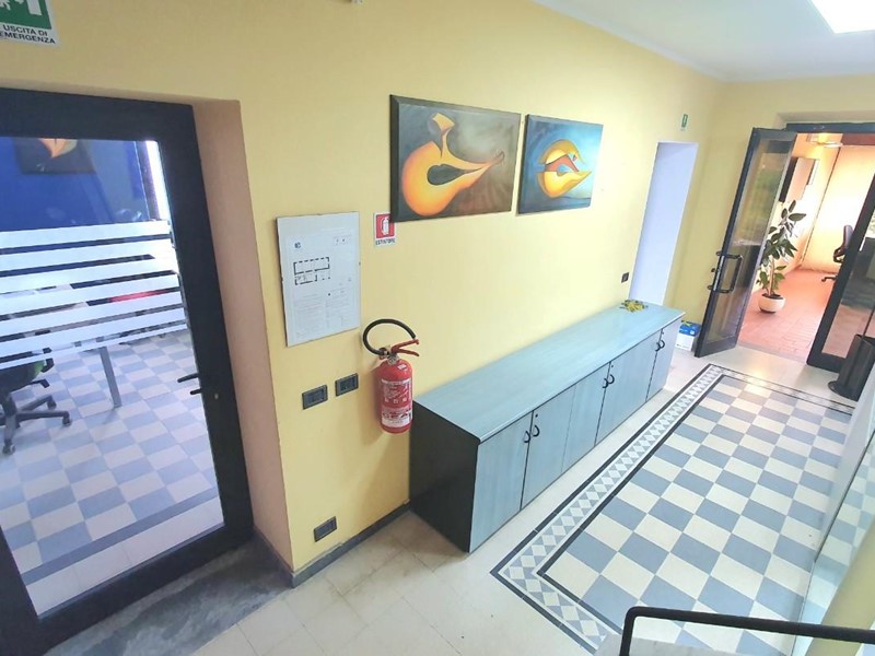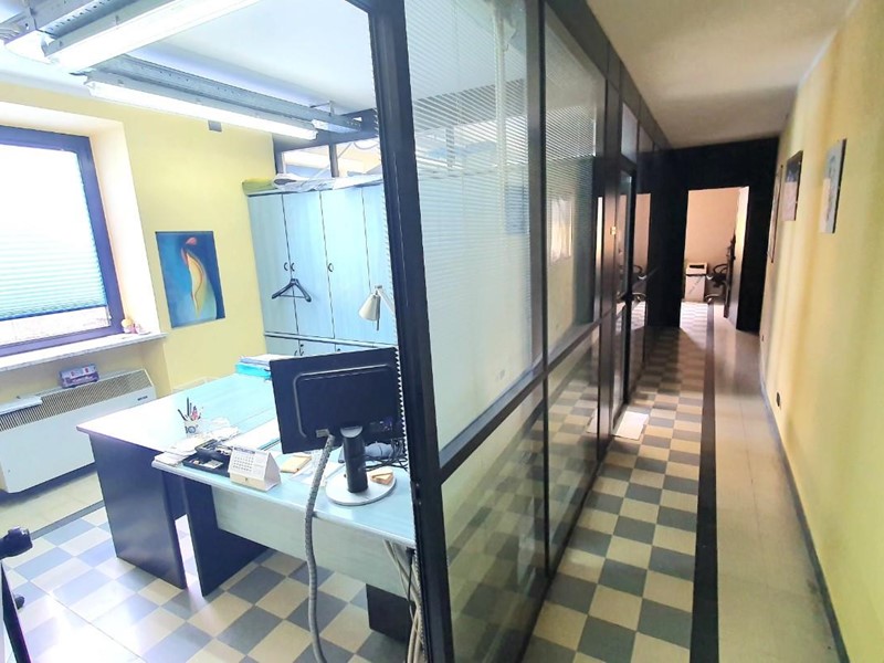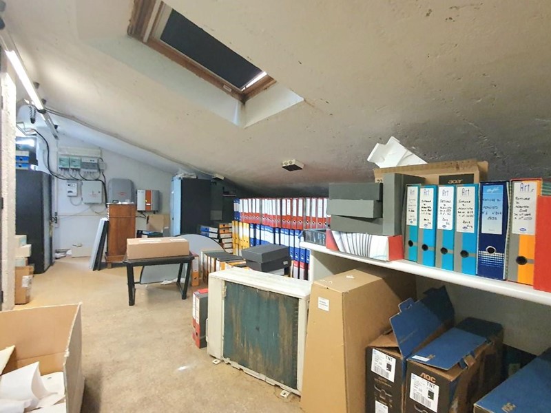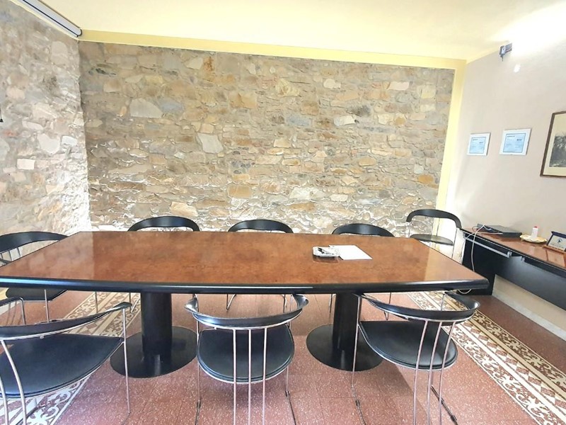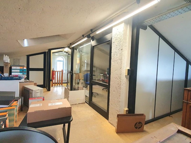 Al piano primo ci sono altri tre grandi vani anch'essi divisi , la bella sala riunioni, un ripostiglio e un bagno finestrato. Tramite scala a chiocciola si accede all'ampia soffitta praticabile.