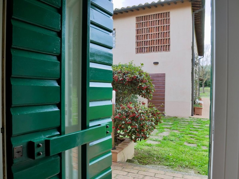 Sul lato esposto a sud e con accesso soggiorno e cucina troviamo il giardino di pertinenza alla colonica, arredato con struttura in legno perfettamente comunicante con la cucina.