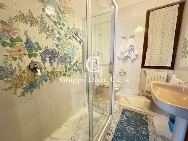 Internamente, la disposizione degli spazi è suddivisa da un ampio soggiorno, che comprende con armonia la zona salotto e quella pranzo, una cucina abitabile con accesso a una veranda esterna vivibile, ideale per godere di pranzi e cene durante la stagione estiva. Completano il piano principale un bagno di servizio e una stanza singola. Un ampio disimpegno conduce alla zona notte, composta da tre camere da letto matrimoniali e un ulteriore bagno dotato di box doccia.
