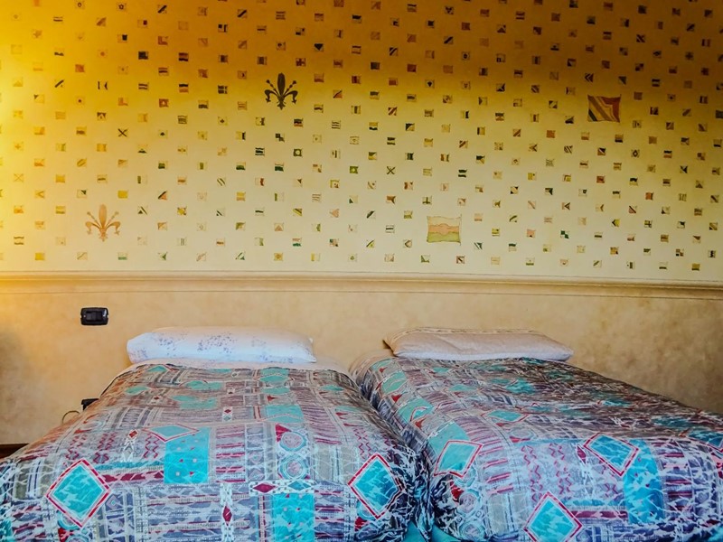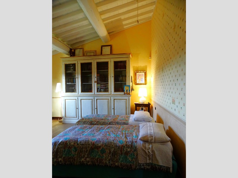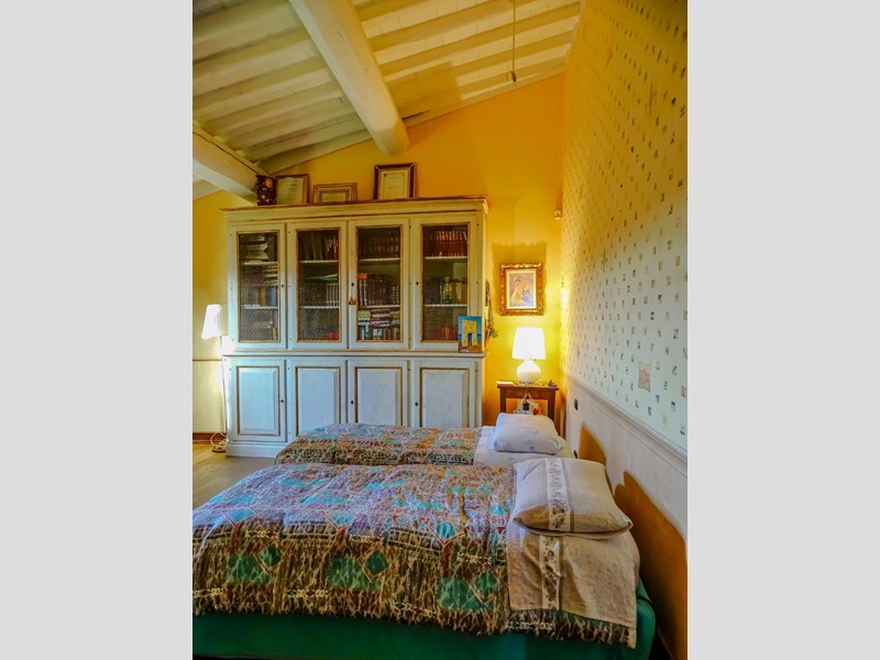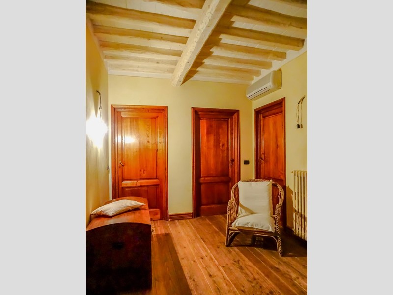Il primo piano, parquet, è dedicato alla zona notte con quattro camere da letto luminose e due bagni. Travature in legno naturale.