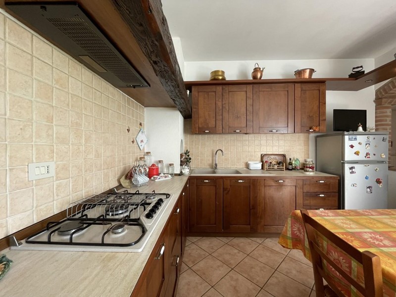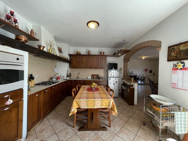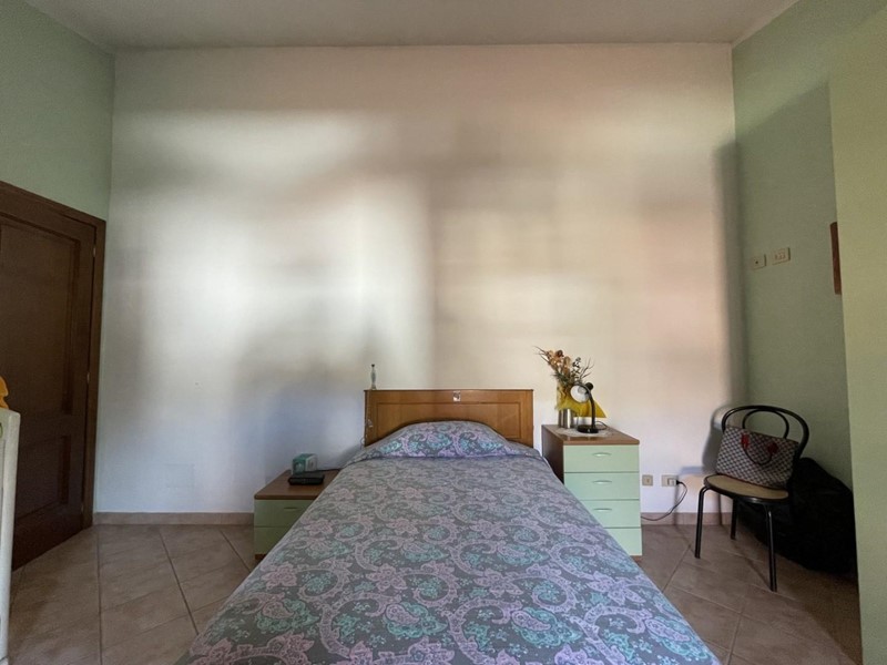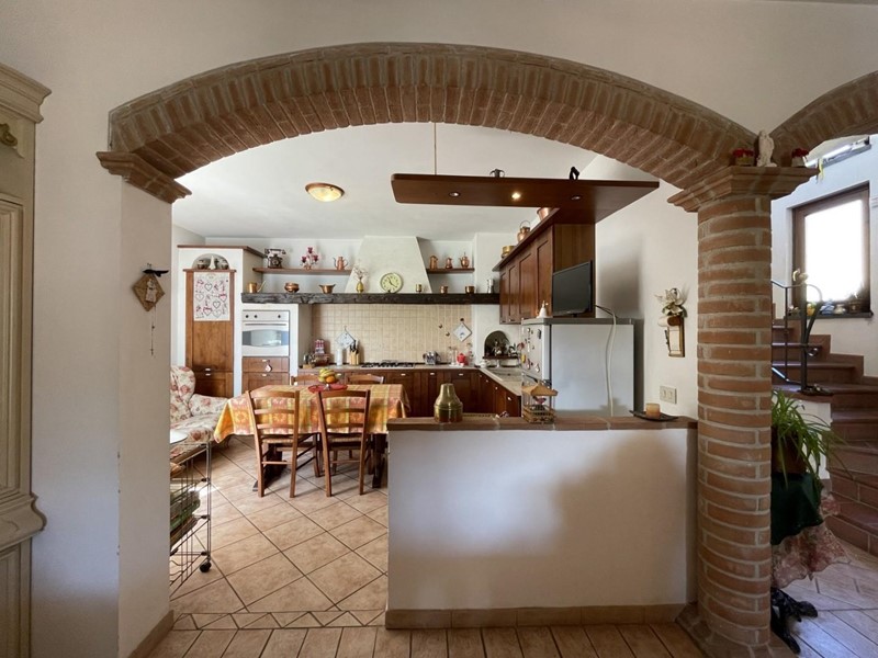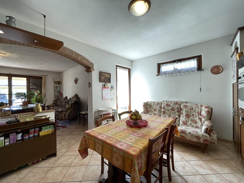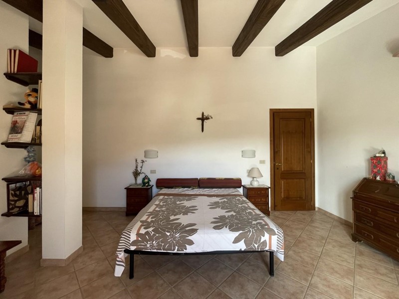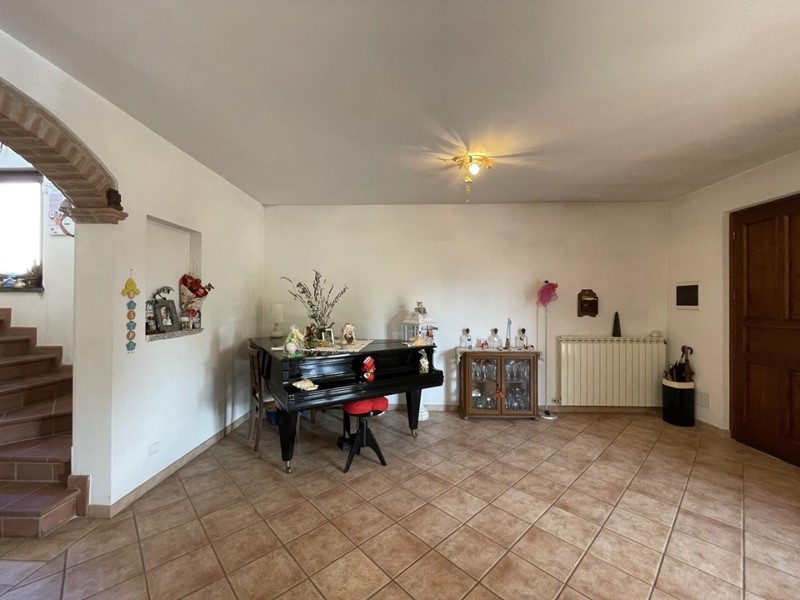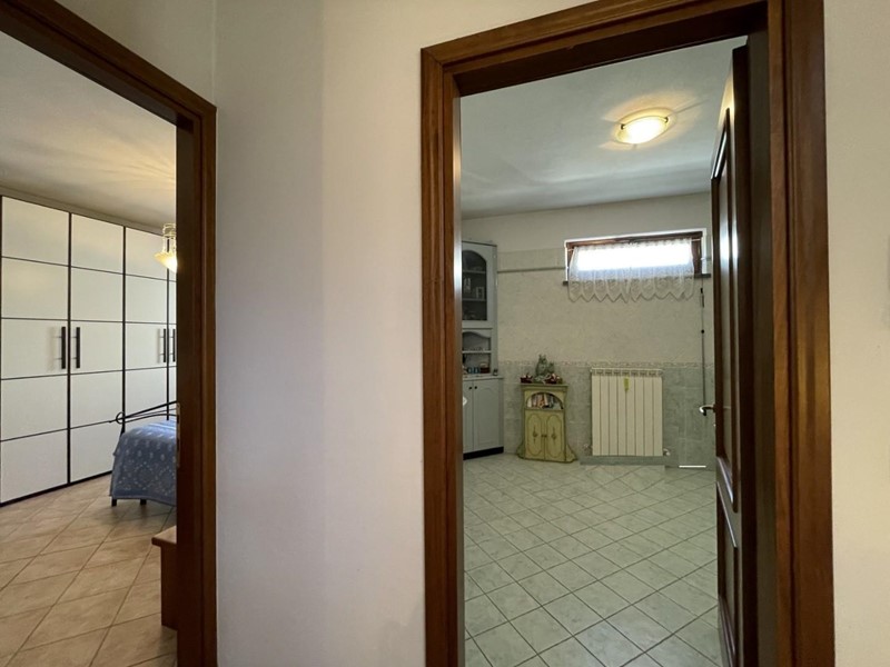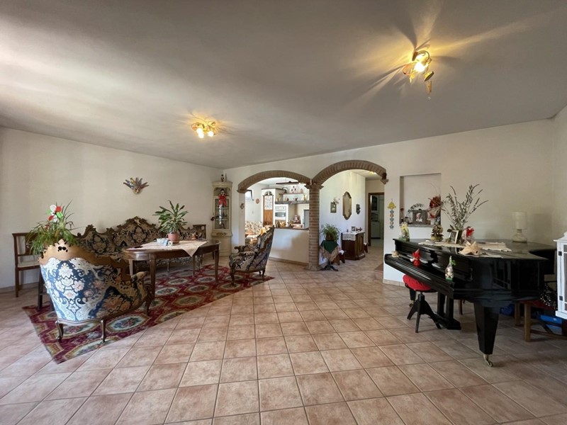 L'accesso avviene, superato il portico di ingresso, direttamente nell'ampio salone. Adiacente a questo ambiente trova posto la cucina abitabile servita da porta-finestra per fuoriuscire nel giardino. Percorrendo il disimpegno si raggiunge la prima camera matrimoniale a piano. A disposizione di questo livello un primo bagno servito da vasca.