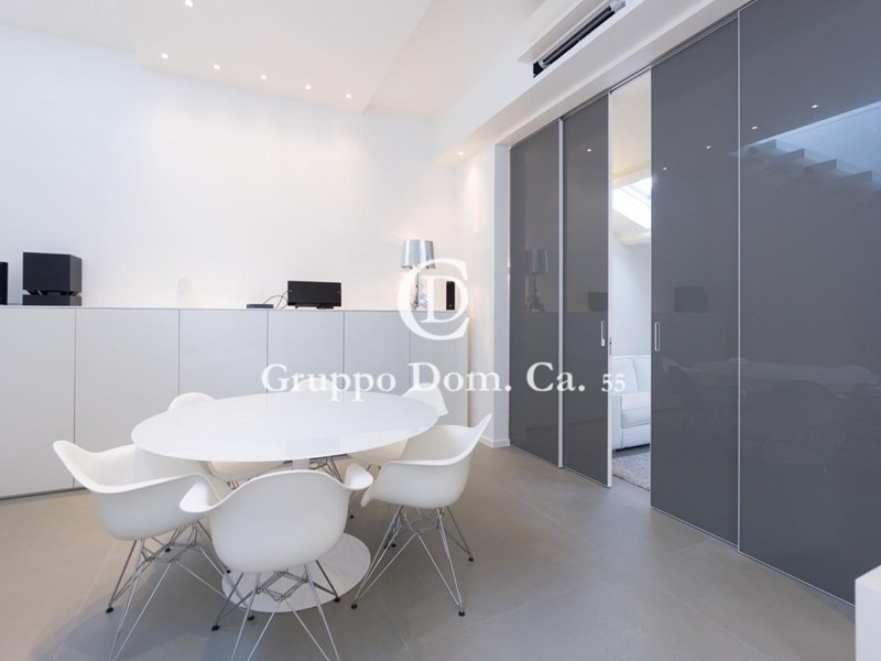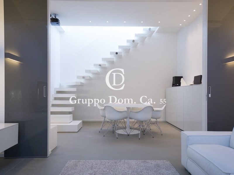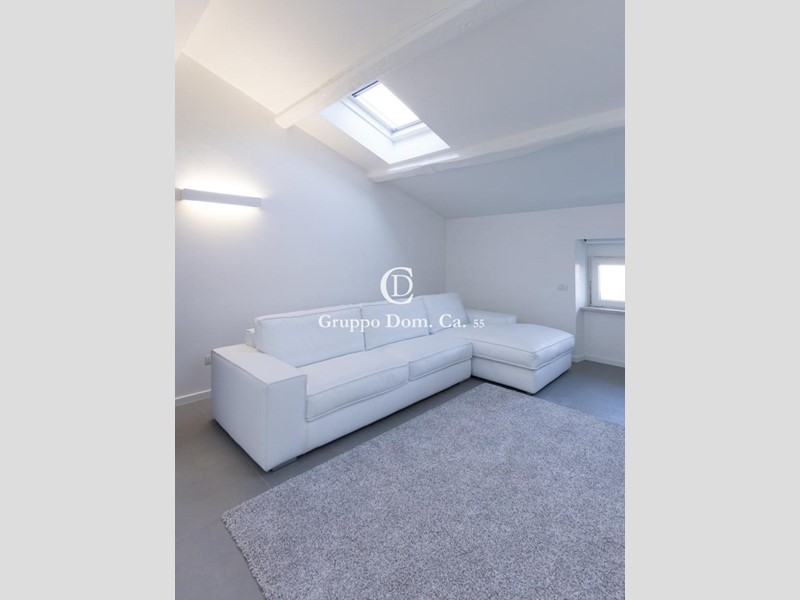 L'attico, di circa 90 mq è stato completamente ristrutturato nel 2013 con tecnologie moderne e finiture di alta qualità. L'ingresso conduce a un ampio e luminoso spazio living open - space, caratterizzato dal predominio del bianco sulle pareti e negli arredi, accostato al grigio delle pavimentazioni in gres. Questo spazio è diviso in una cucina completamente attrezzata, una zona pranzo e un soggiorno con vista sulla piazza sottostante. Le porte scorrevoli permettono di godere di maggiore privacy all'occorrenza.