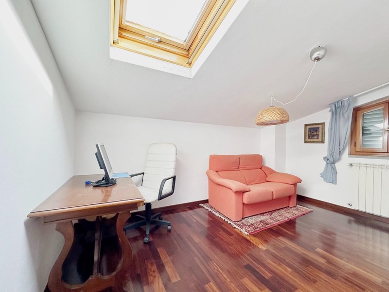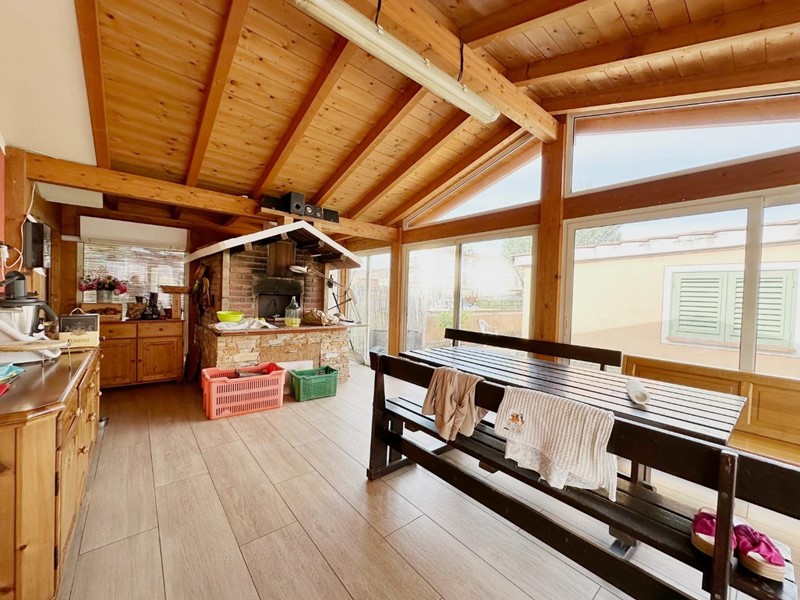 Composta al piano terra da ingresso in soggiorno, cucina abitabile, disimpegno, due camere matrimoniali, una camera singola con cabina armadi e un bagno con vasca. Mentre al piano primo, accessibile tramitesia scala interna che esterna, ampio soggiorno con caminetto e cucina a vista, camera matrimoniale, ripostiglio, bagno con doccia e studio mansardato.