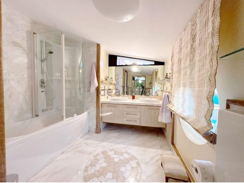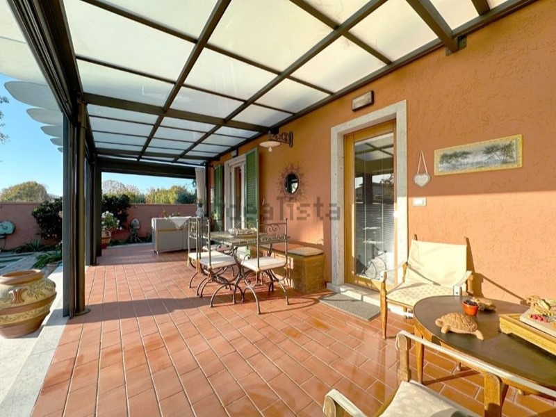 La villetta è stata edificata nel 2004 ed è impreziosita da rifiniture di pregio completamente fuori capitolato, curate in ogni dettaglio. La pavimentazione della zona giorno è in marmo mentre per le camere è stato scelto un pregiato parquet . L'ingresso tramite un cancello elettrico carrabile porta nel vialetto di parcheggio, alla fine del quale si apre il giardino privato con prato all'inglese. Lo spazio esterno è di circa 350 metri quadrati ed attrezzato di un ampio gazebo posto in posizione centrale. L'abitazione si dispone su due livelli con la zona giorno al piano terra e quella notte al primo piano. Lo spazioso ingresso è diviso dal salone da un elegante porta scorrevole in vetro. L'ambiente è confortevole, spazioso e dotato di un elegante camino. La cucina è spaziosa ed arredata con una parete cottura angolare e un tavolo per sei persone. Ogni ambiente gode di una porta finestra che esce sul porticato in ferro battuto e dotato di tende elettriche che permettono di sfruttarlo sia nella stagione estiva sia durante quella invernale, rendendolo un ulteriore ambiente vivibile. A completamento del piano terra troviamo un ripostiglio ed un primo bagno con doccia multifunzione. Al primo piano ci si accede tramite elegantissima scala in marmo con ringhiera in ferro battuto. L'ampio disimpegno dà accesso a tutti gli ambienti del primo piano. La camera principale è matrimoniale e dotata di un incantevole loggiato. La seconda camera è doppia, così come la terza, dotata di balcone e attualmente adibita a stanza armadi. Vi è poi il bagno principale della casa, rivestito in marmo, con vasca idromassaggio.