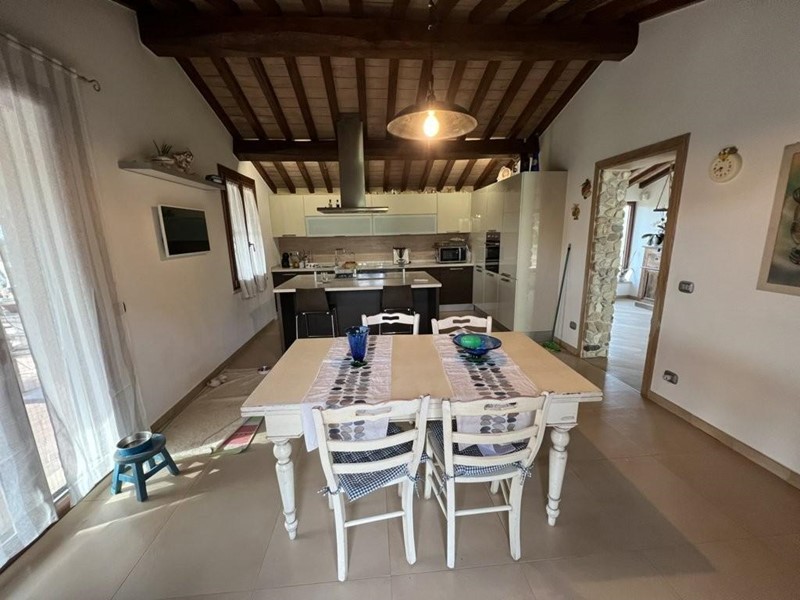 La villa si sviluppa su due piani fuori terra ed è così composta: cucina abitabile, ampia zona soggiorno con caminetto, camera da letto e bagno con vasca idromassaggio, al piano terra; da comoda scale si accede al piano primo dove si trovano 3 camere mansardate, bagno, una zona aperta con vista sul soggiorno ed una bella terrazza dalla quale si scorge anche il mare.