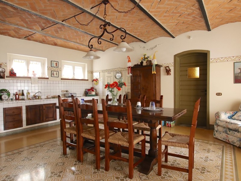Al piano primo 3 camere matrimoniali con 3 bagni, studio e ampia terrazza di 38 mq; al piano secondo ulteriori 4 vani ( camere) e 3 bagni Attaccato al corpo principale troviamo tre appartamenti terratetto composti ciascuno al piano terra da zona giorno con salotto e cucina, al piano primo da due camere e bagno. Sul terreno, a poca distanza dalla villa abbiamo un grande fabbricato grezzo di mq.150 a piano, attualmente al grezzo strutturale con tetto rifatto, che necessita di completamento per destinazione residenziale e/o commerciale.