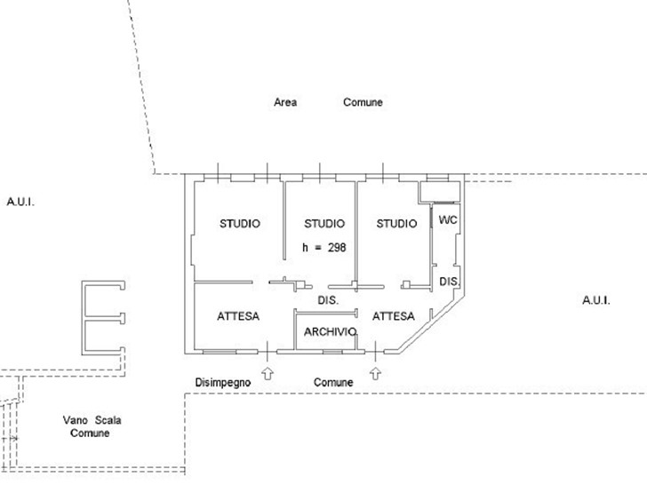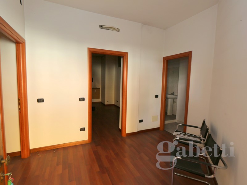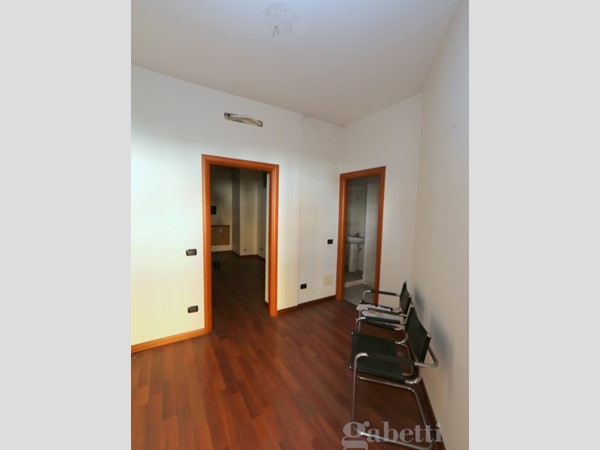 La soluzione, posta al piano rialzato, è composta da ingresso sulla sala d'attesa, locale archivio ed ulteriore spaziosa sala d'attesa, antibagno e bagno, tre uffici.
