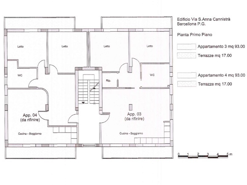 Al primo piano ci sono due ulteriori appartamenti allo stato rustico con cucina-soggiorno, due camere da letto e bagno.