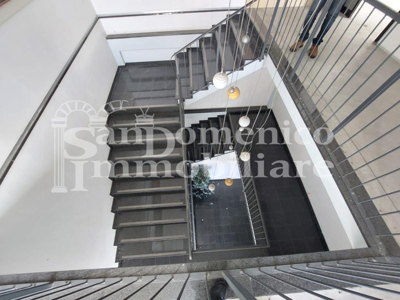 Attraverso la scala in marmo o l'ascensore si accede al primo piano, dove troviamo: ingresso in unico ambinte suddiviso ad uffici, bagni e locale commerciale e archivio.