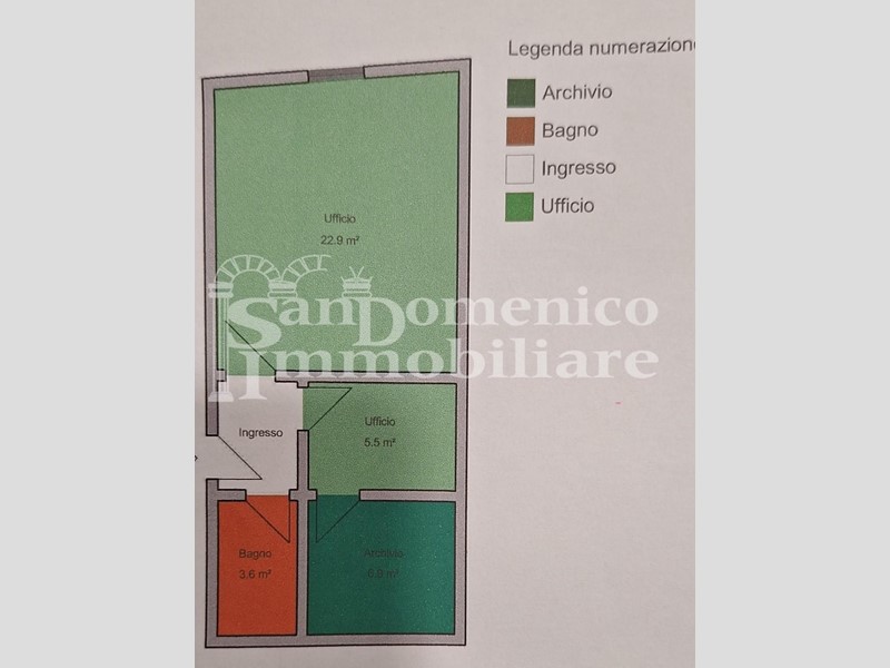 L'appartamento è cosi composto: attraverso la scala esterna a comune con altra attività si raggiunge il primo piano, ingresso in ampia sala d'attesa in comune con l'altro ufficio che si trova al solito piano, ingresso in disimpegno, due uffici, locale archivio e bagno.