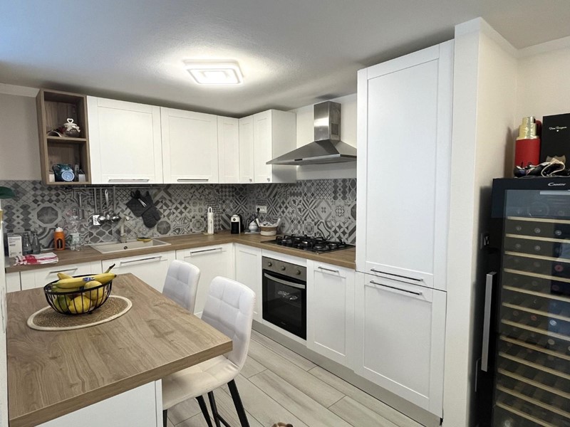 dalla terrazza si accede all' interno della casa, dove si trova una grande sala, una cucina abitabile con balcone, e una bagno di servizio completo di doccia.