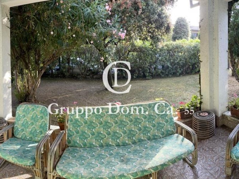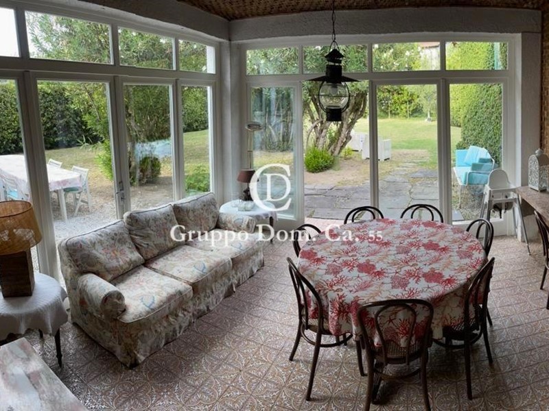 Proseguendo dritto dal salone si accede alla sala da pranzo verandata, che offre una vista sul grande giardino di circa 1100 metri quadrati, curato per garantire tranquillità e privacy.