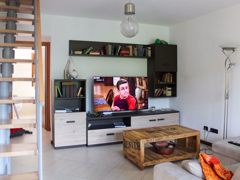 E' parzialmente arredato (sono presenti solo la cucina, un mobile per televisione in soggiorno e un armadio nel soppalco).