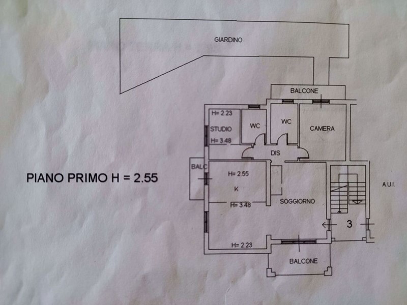 Ampio e luminoso appartamento al piano primo composto da: ingresso, soggiorno 20 mq, cucina abitabile con zona pranzo, camera matrimoniale, cameretta/studio, doppi servizi. La superficie totale è di 95 mq. Mansarda al piano secondo ad uso ripostiglio (ulteriori 50 mq). Terrazzo coperto di circa 10 mq sul fronte dell'appartamento e balcone sul retro. Dalla camera matrimoniale si accede al giardino (50 mq).