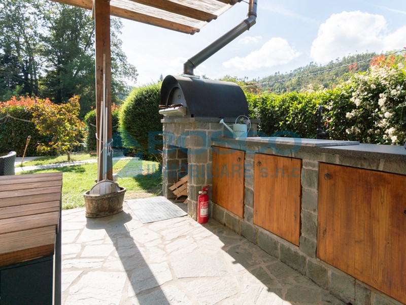 Ampia zona giorno con cucina in muratura, 1 servizio ed accesso al giardino organizzato con pergolato e zona barbecue;