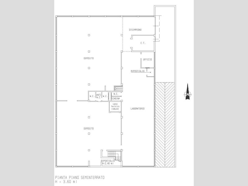Porzione immobiliare a carattere artigianale sita al piano seminterrato di un complesso produttivo distribuito su due livelli di cui uno seminterrato. L'unità di 1084 mq, direttamente raggiungibile da rampa esterna carrabile, ha altezza intera di 3,60 m e si compone di un disimpegno di ingresso, due ampi vani uso deposito, laboratorio, un vano uso ufficio, locali tecnici e servizi igienici. Nell'edificio sono ricavati complessivamente 3 laboratori artigianali. Il complesso è stato edificato nei primi anni '80 ed è stato oggetto di un intervento di ristrutturazione nei primi anni 2000. Ha strutture tradizionali dell'edilizia civile con telaio di cemento armato in opera, tamponamenti con mattoni faccia-vista e copertura a falde con manto in coppi. Le aree esterne comuni, utilizzate per la movimentazione ed il parcheggio di mezzi ed autoveicoli, sono prive di pavimentazioni.