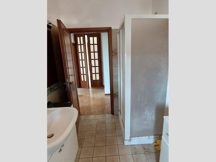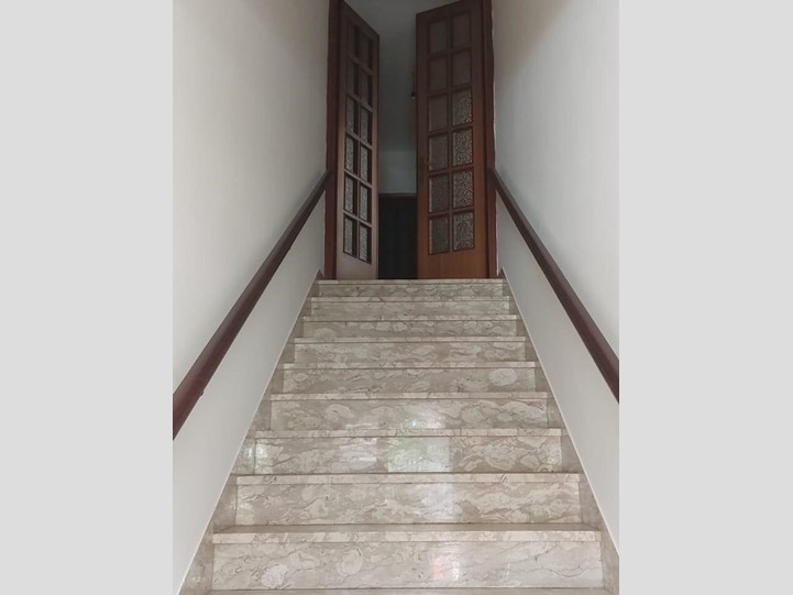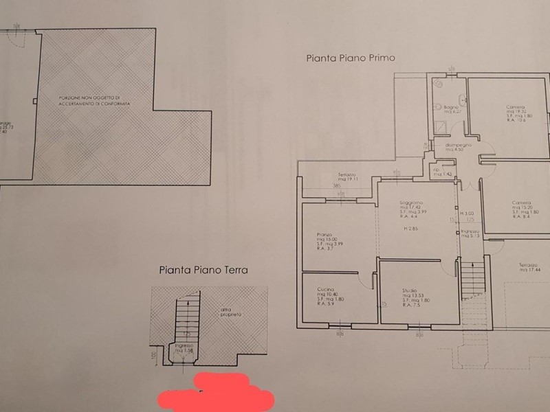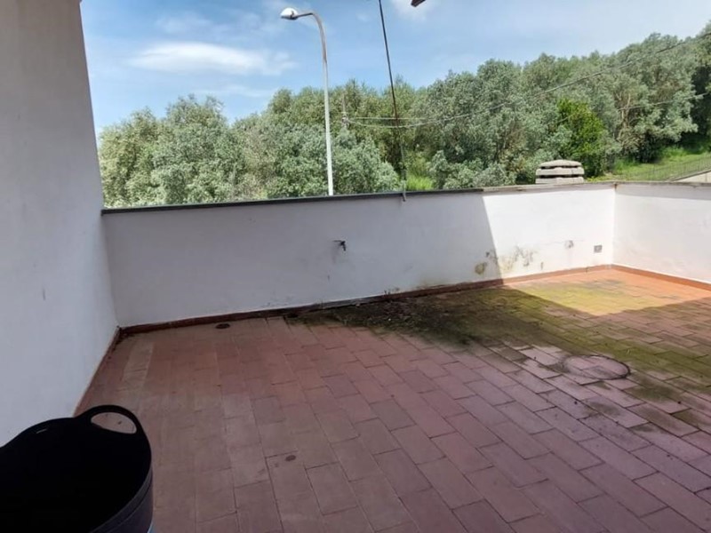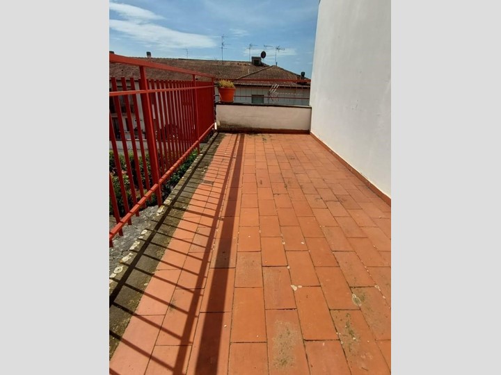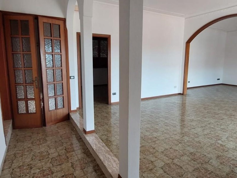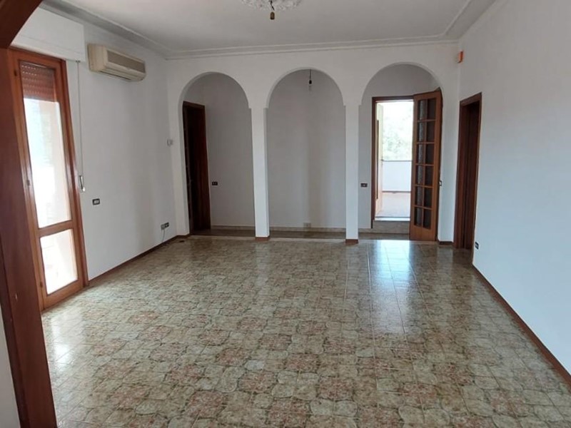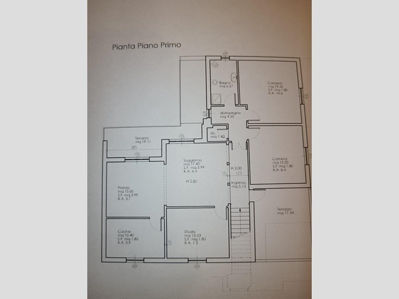 Ingresso da resede di proprietà, scala che porta al Piano Primo dell' appartamento che si apre su luminoso salone doppio, bella terrazza abitabile angolare, cucina separata , studio (possibilità di terza camera) , seconda terrazza abitabile ( di mq. 17) disimpegno notte, ripostiglio , due camere MATRIMONIALI e un servizio finestrato. .