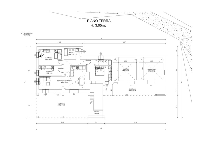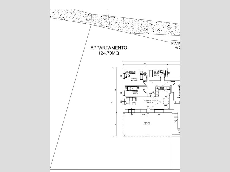 L'appartamento, cui si giungerà tramite una strada privata a uso esclusivo degli acquirenti, è costituito da living con cucina a vista, affacciato direttamente su un arioso portico di 52 mq (che potrà eventualmente essere chiuso con delle vetrate, creando un'importante estensione del soggiorno), disimpegno che conduce alla zona notte, bagno, camera singola, camera matrimoniale e camera padronale con bagno en suite. Completano la proprietà un vasto giardino perimetrale di 525 mq ad uso esclusivo e due posti auto riservati.